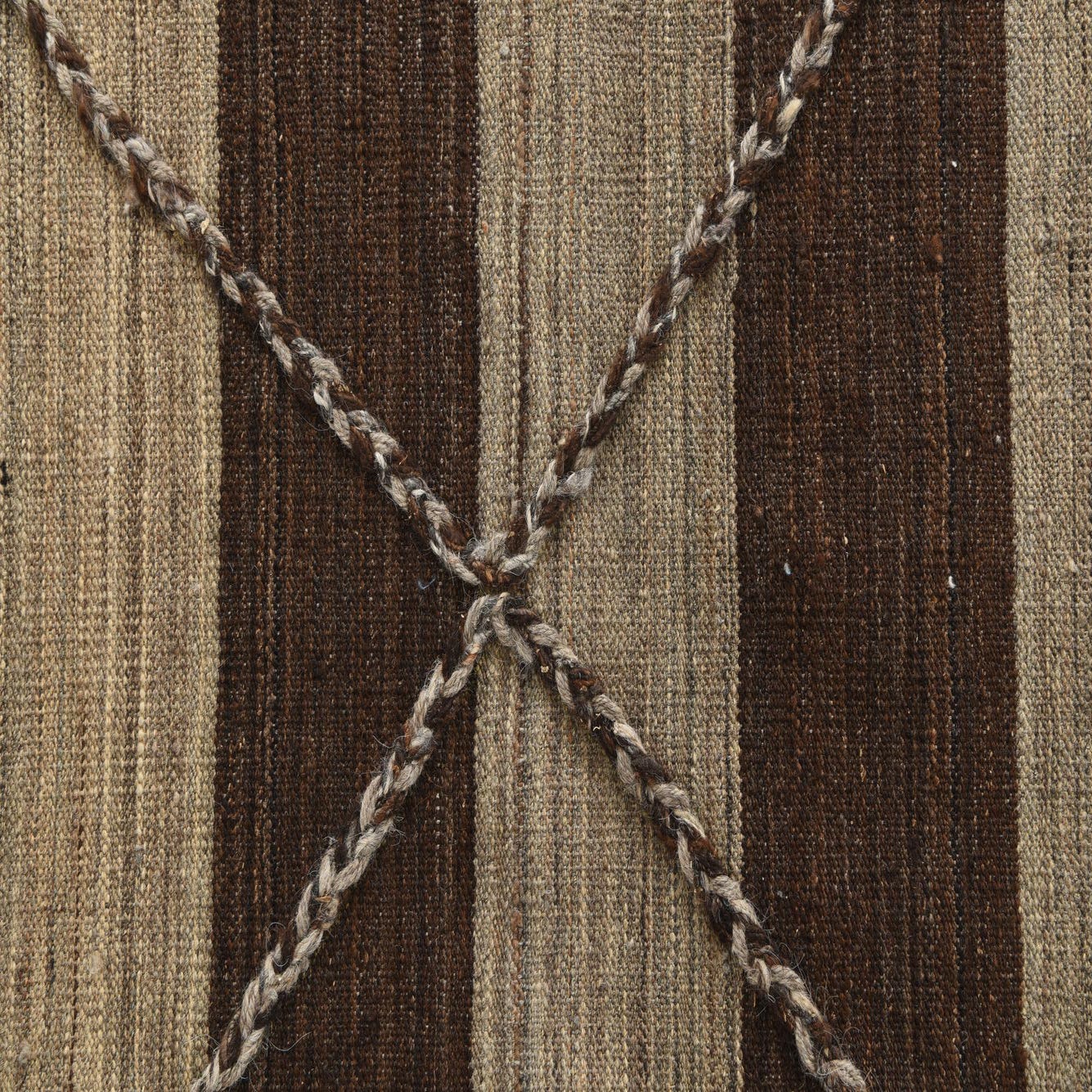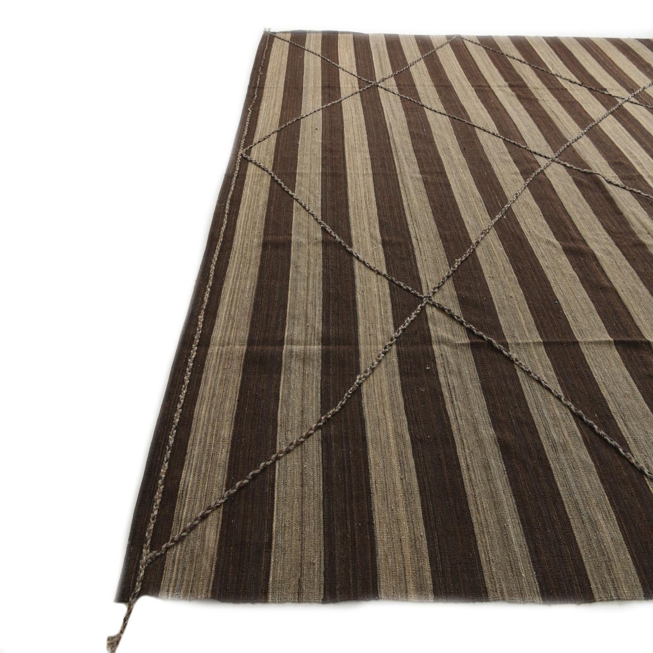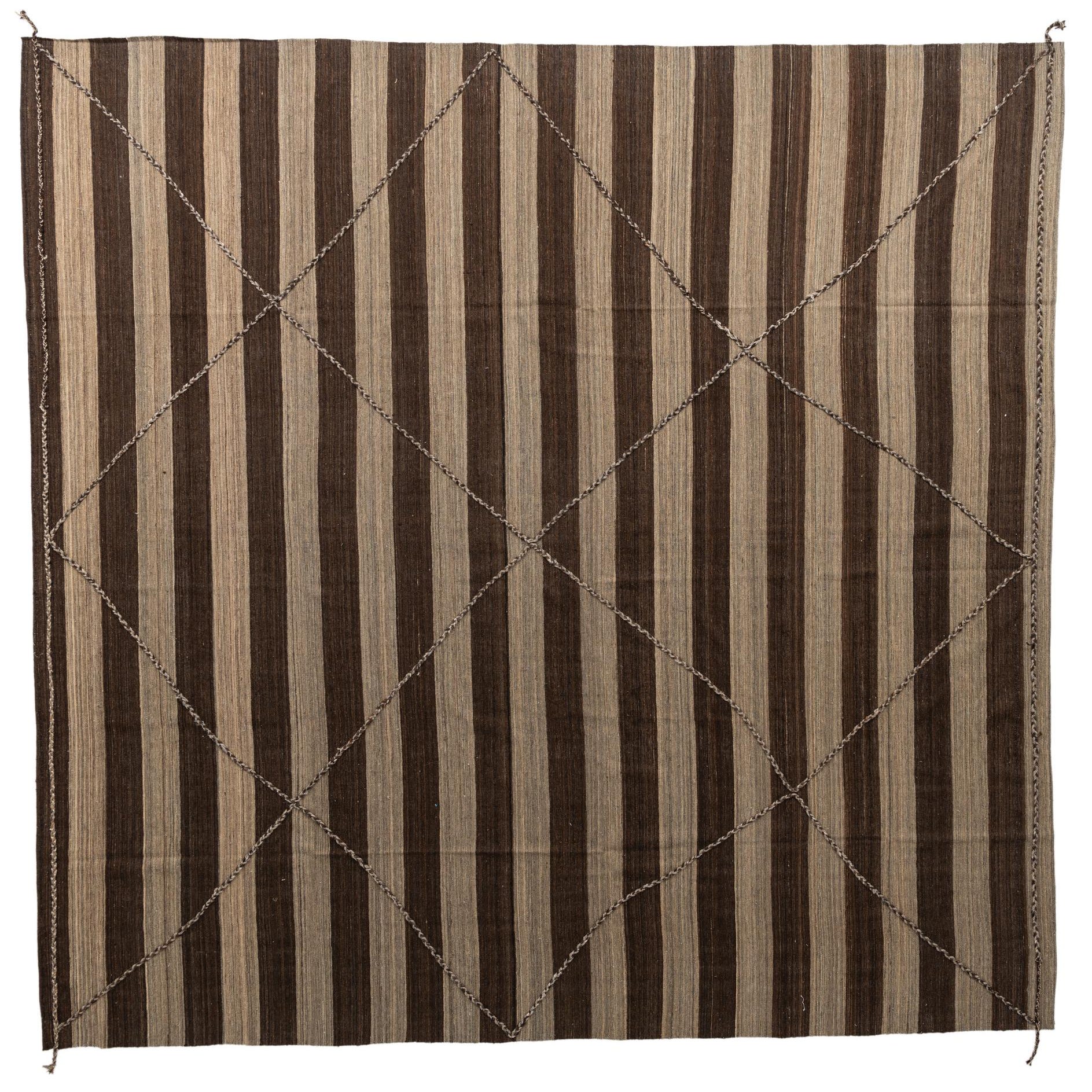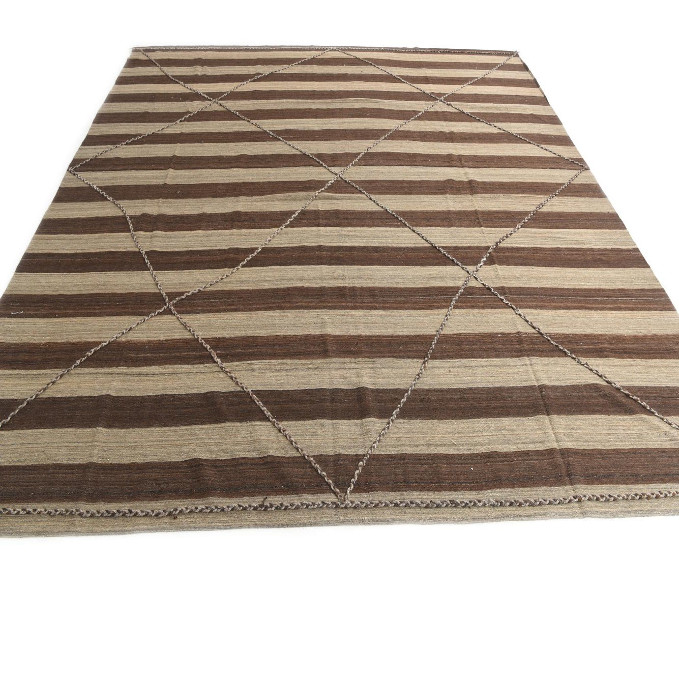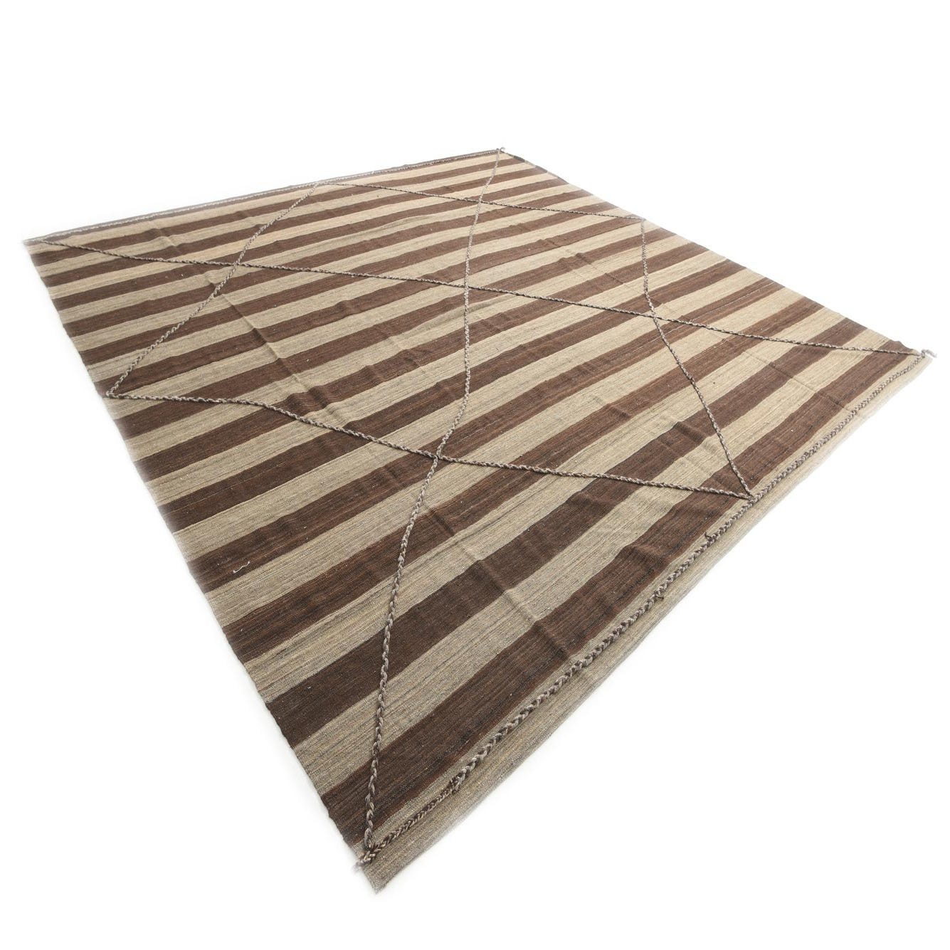This Kilim Modern rug, a 12 Ft Square and hand-woven of 100% wool, offers a contemporary take on traditional flatweave textiles. Its pattern showcases a combination of brown, beige, and light brown stripes, intersected by subtle geometric diamond shapes, creating a dynamic visual effect on the rich brown background. The textural qualities of this woolen piece are inherently durable and bring a warm, tactile comfort to any space.