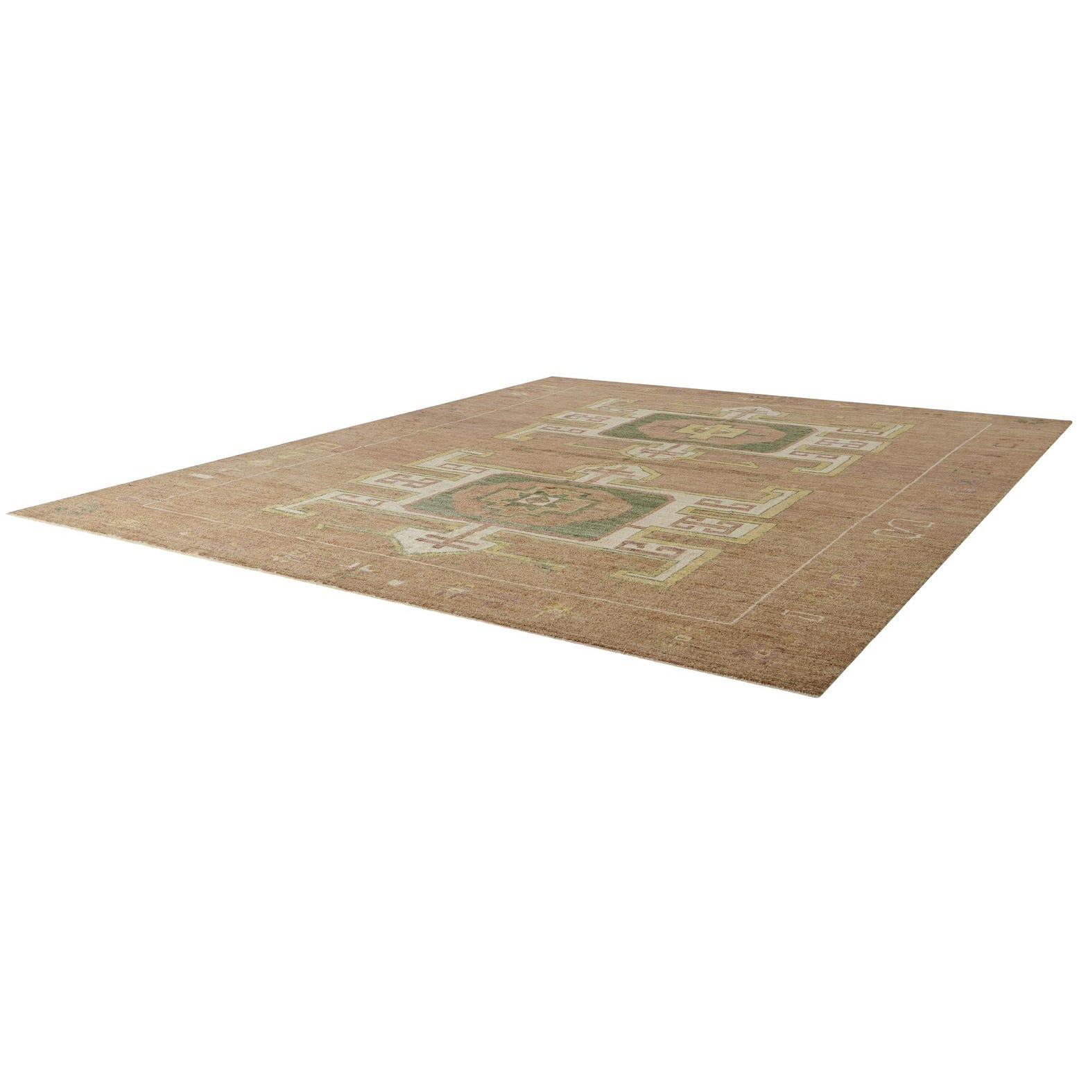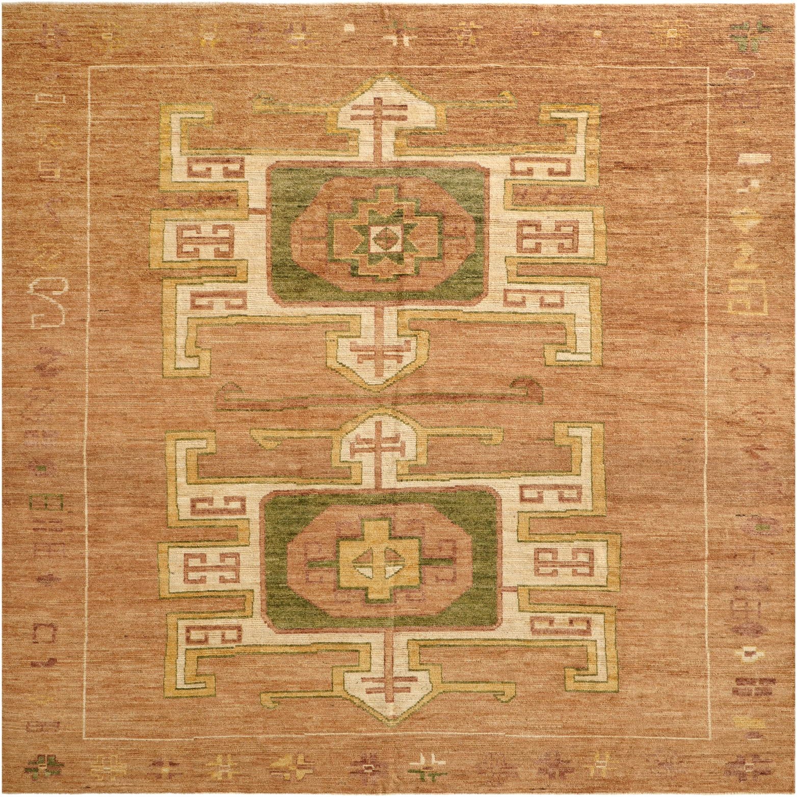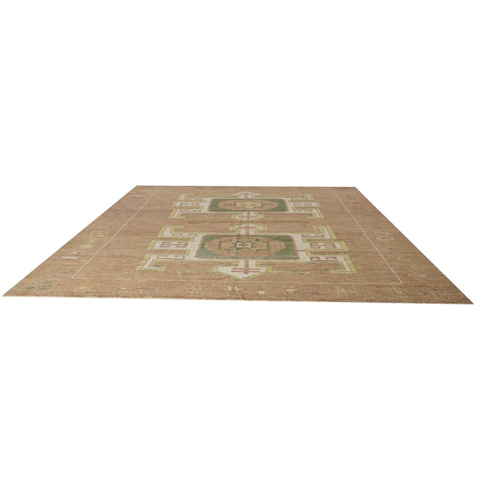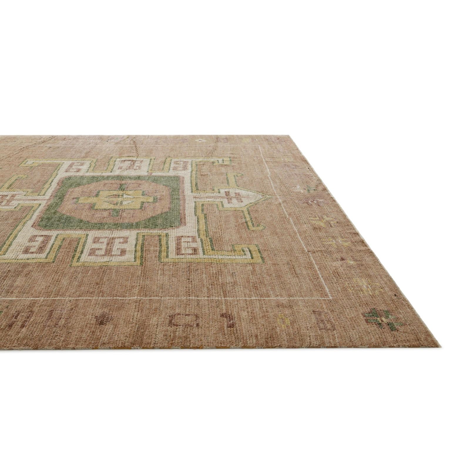 Primary color is Brown. Colors in this rug include: Brown, Green, Ivory, Yellow, Light Brown, Beige.