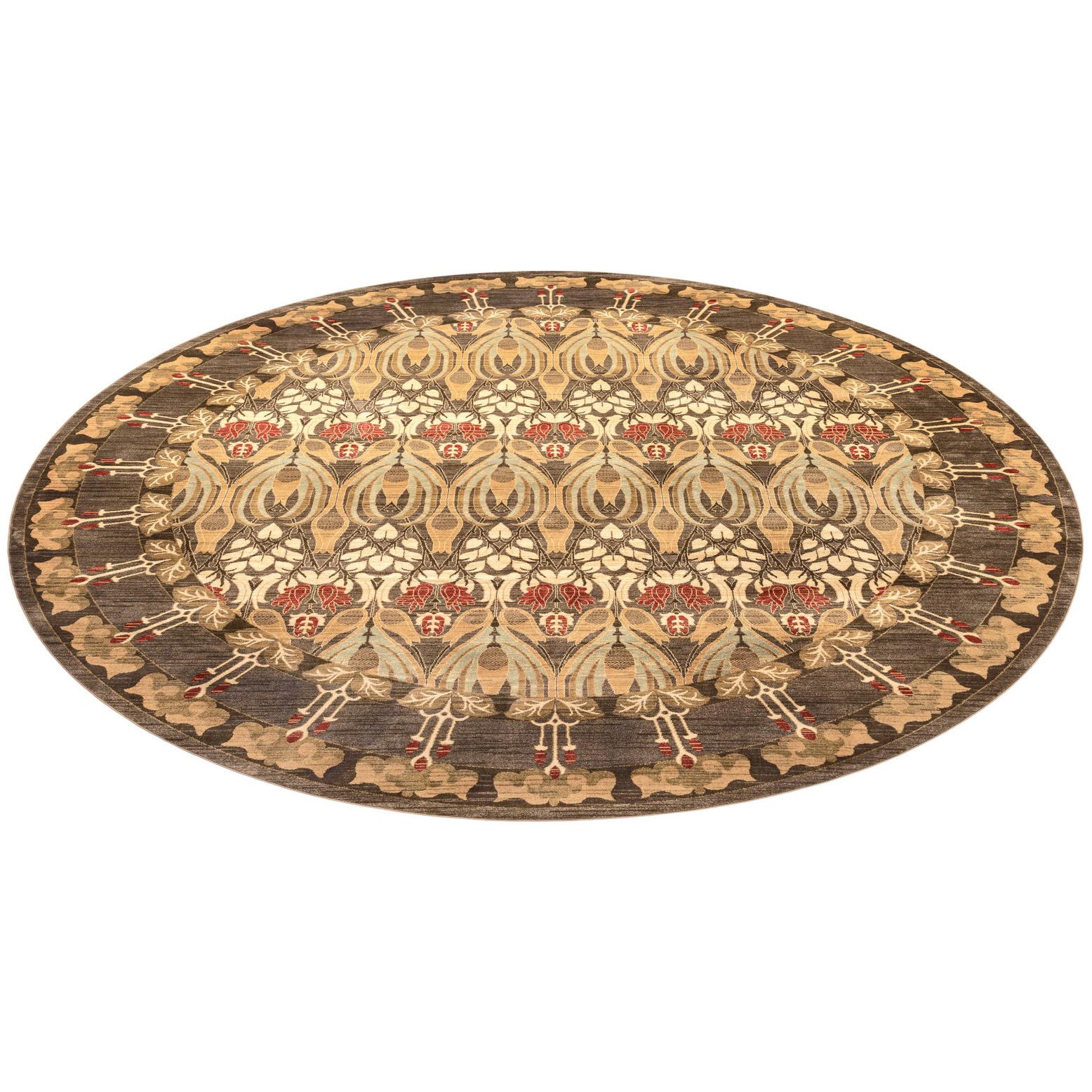 A 13' round brown and tan modern floral rug with red accents, featuring an intricate botanical pattern.