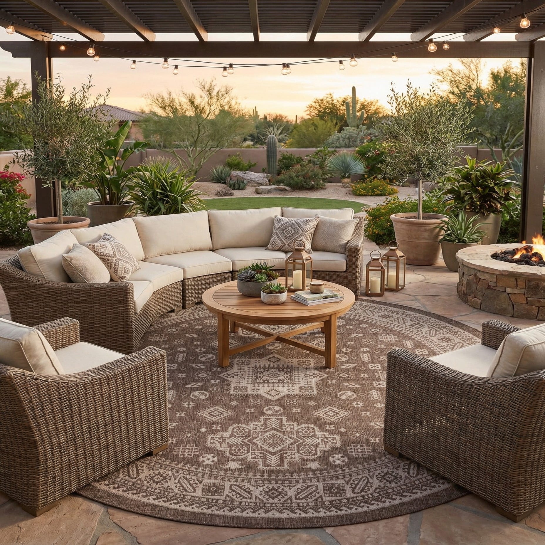 Place this rug on a covered patio or sunroom to bring a collected, global sensibility to outdoor living, or use it indoors beneath a round dining table or in a cozy seating nook. It pairs naturally with warm woods, leather or rattan furniture, neutral upholstery and layered textiles; add metal accents or potted greenery to reinforce a southwestern, boho, or modern farmhouse scheme.