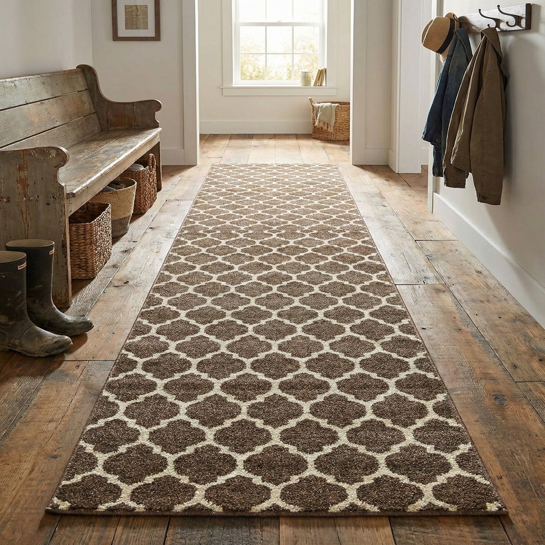 A 13 ft runner rug featuring a modern brown trellis pattern against a tan background, ideal for hallways.