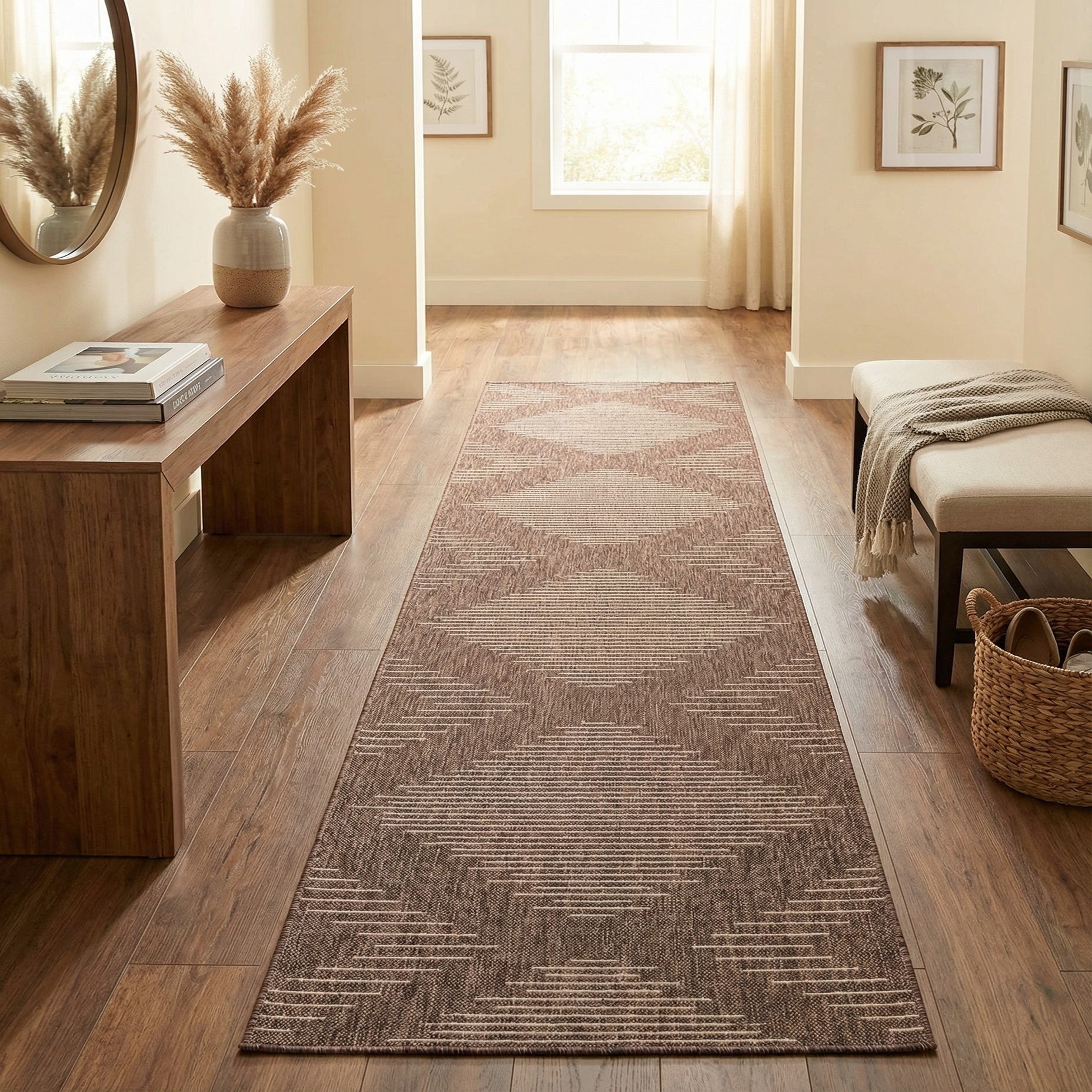 This rug would suit various interior design themes including modern, minimalist, and transitional settings. It is particularly well-suited for outdoor spaces such as covered patios, decks, and porches, providing a cohesive look that blends indoor comfort with outdoor living. Indoor rooms that would benefit from this runner include kitchens, hallways, and entryways where its durability can be fully appreciated.