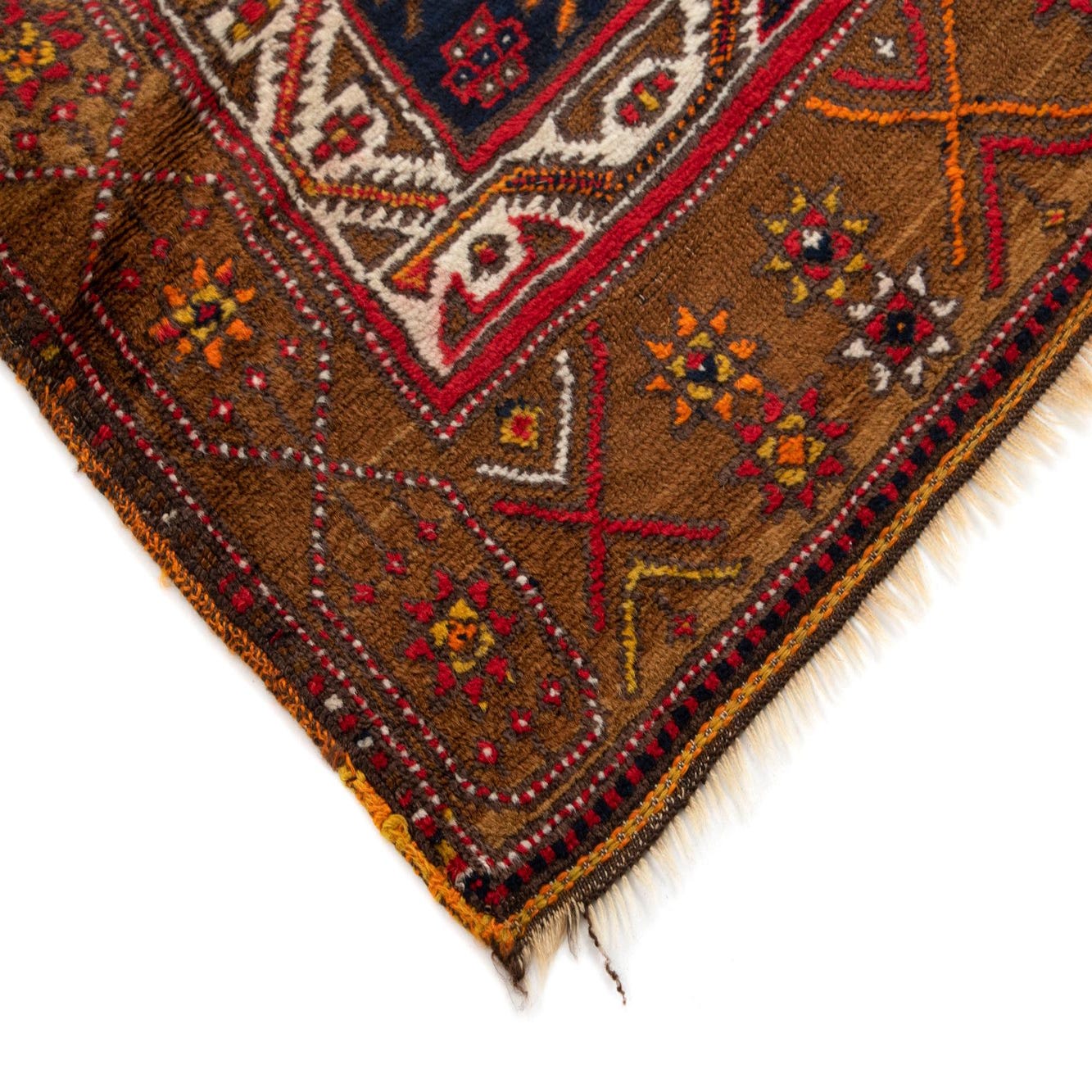 Primary color is Brown. Colors in this rug include: Brown, Dark Blue, Red, Orange, Cream.