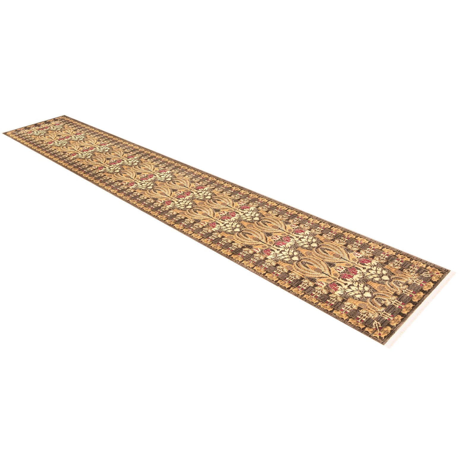 The Chelsea collection 20 Ft Runner rug offers a classic and timeless design with a modern twist, woven with 100% Polypropylene for lasting durability. The pattern presents an ornate floral and scroll motif, rendered in a harmonious blend of brown, beige, olive, rust red, tan, and light brown hues, with a predominant brown background that anchors the design.