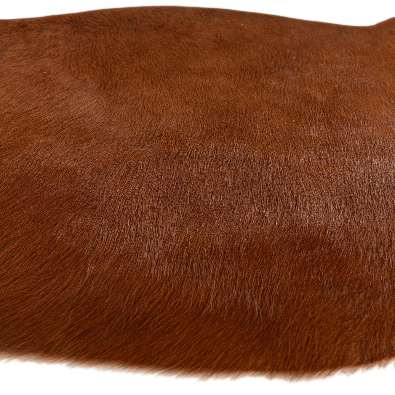 A 2x3 brown cowhide rug with an irregular, natural shape, showcasing its flat, textured pile.