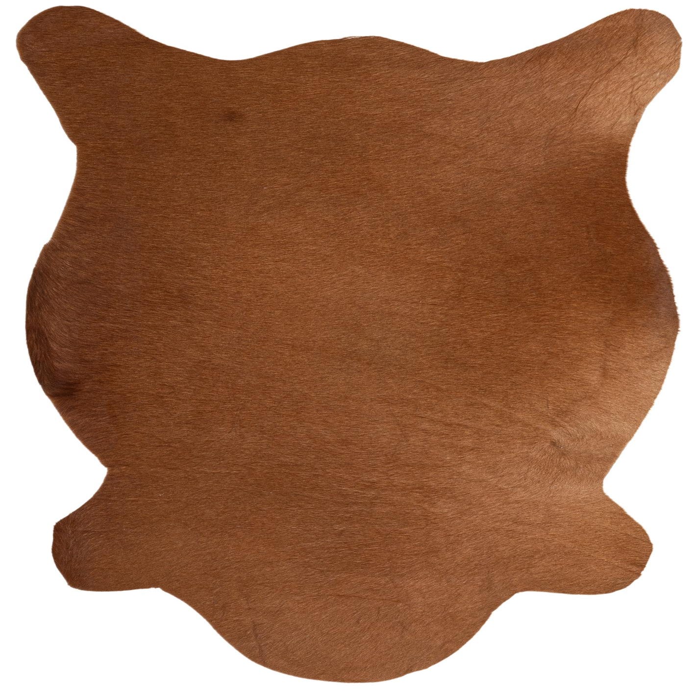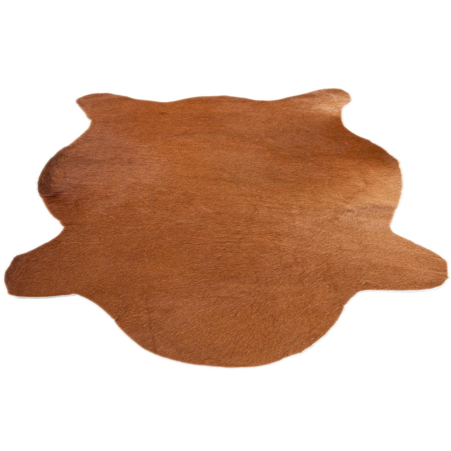 A 2x3 rectangular Rugs.com Cowhide Leather rug in solid brown and tan, showcasing its natural shape and textured flat pile.