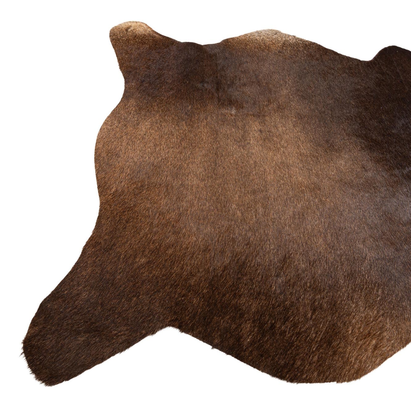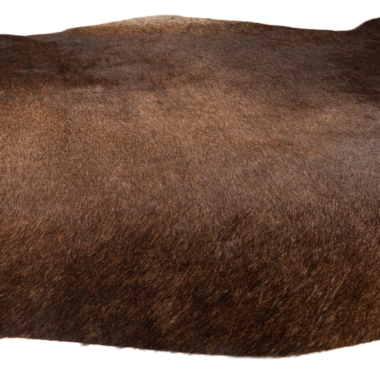 Handmade from cowhide and leather, this rug presents the natural, irregular silhouette of a classic hide. The background is a warm, even brown with deeper black tones along the edges and subtle tonal variation across the hair that adds visual depth. The hair-on-hide surface is dense and velvety underfoot while the leather underside provides a firm, durable foundation; the short pile lies smoothly and catches light for a gentle sheen.