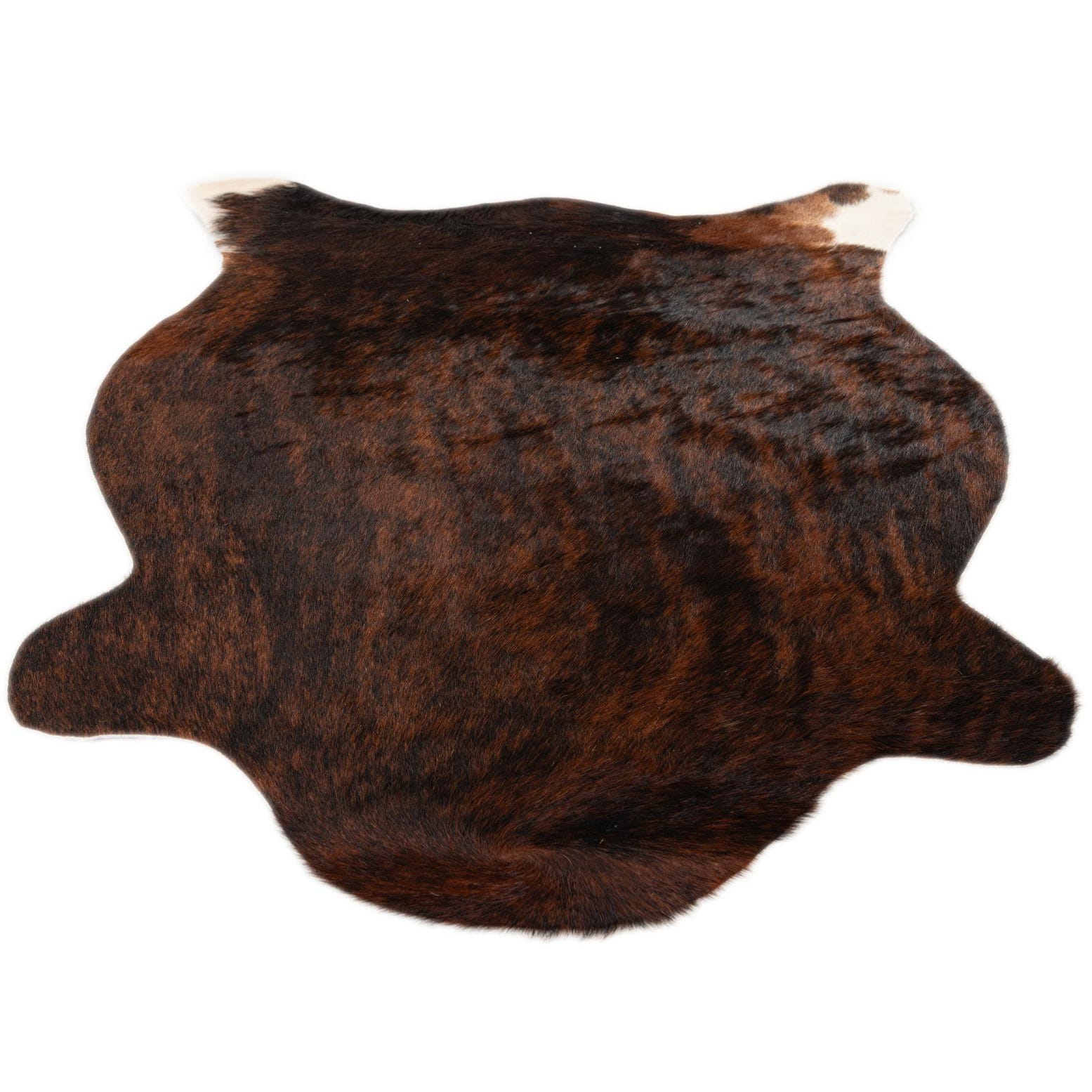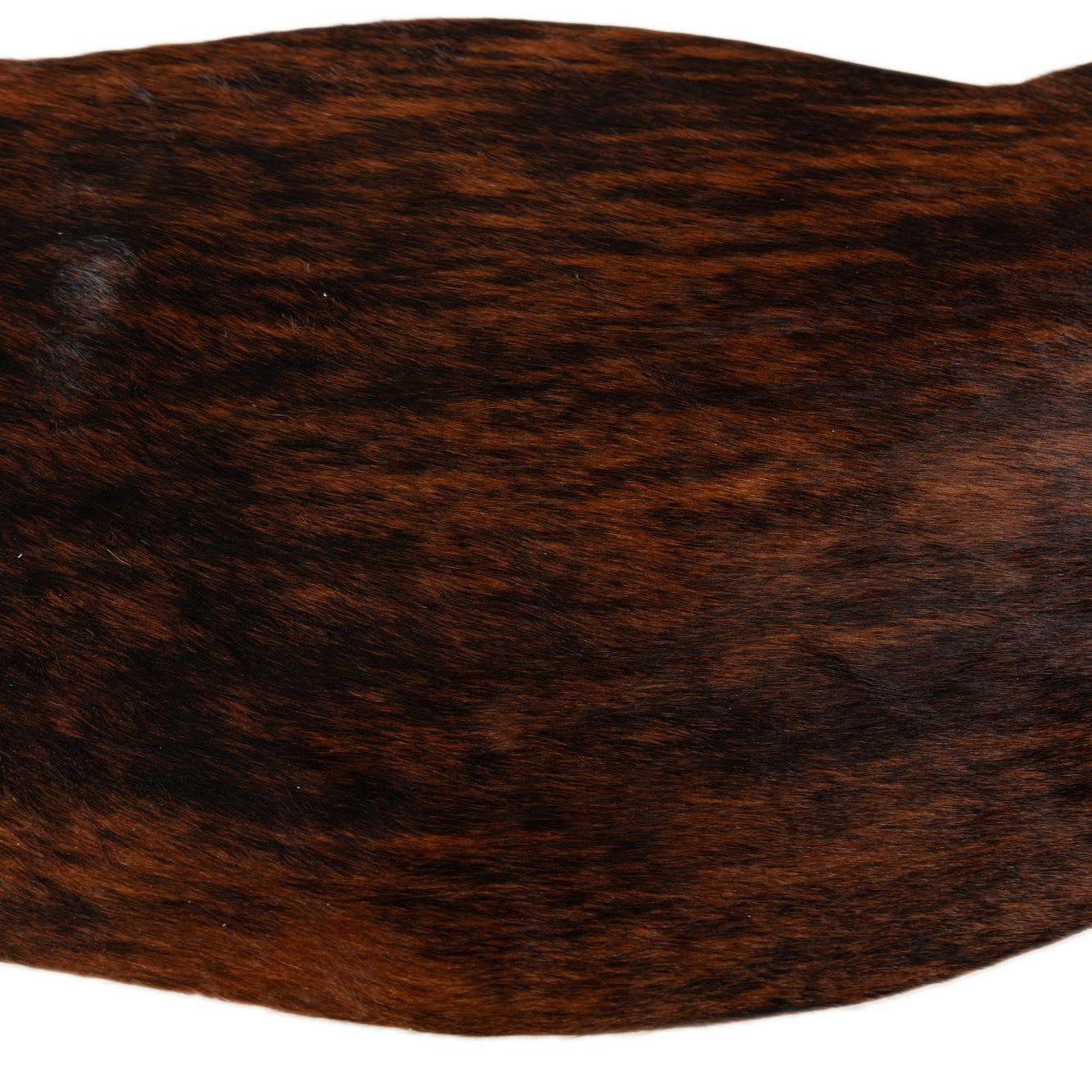 The surface is low-pile and velvety to the touch, with a slight sheen where the hair catches the light and a firm leather underside for structure. The brown-and-black palette pairs well with wood tones, leather seating and metal accents, making this rug a good choice as an accent by a bedside, layered beneath a coffee table, in a cozy reading nook or at an entryway to add textural contrast in modern rustic, farmhouse, or eclectic interiors.