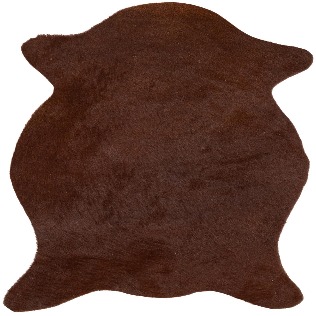 A 2x3 rectangular brown cowhide leather rug with a natural, irregular shape and flat, textured pile.