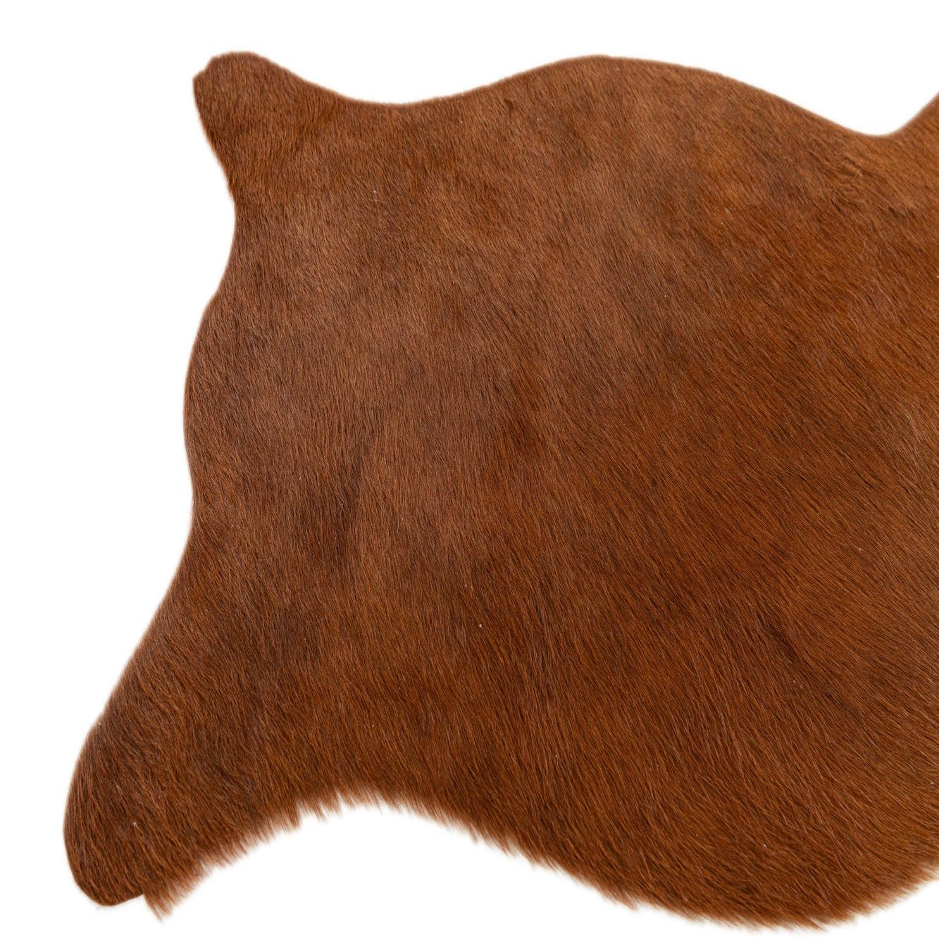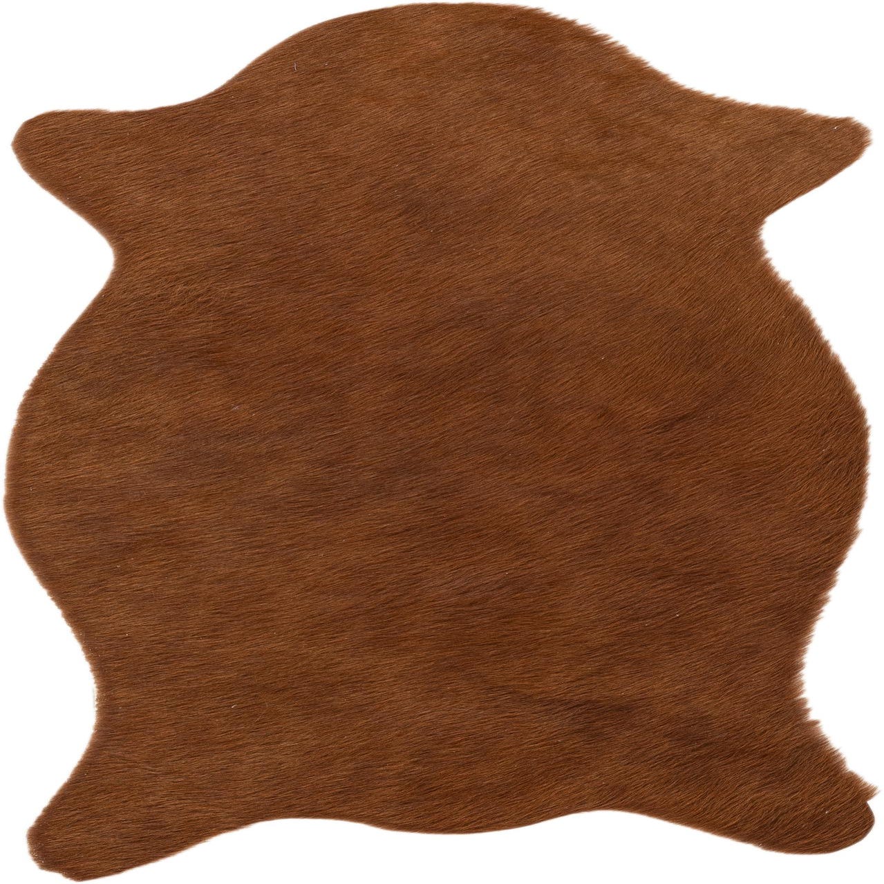 A 2x3 rectangular brown cowhide leather rug with a natural, irregular shape and flat pile, perfect for a modern living room.
