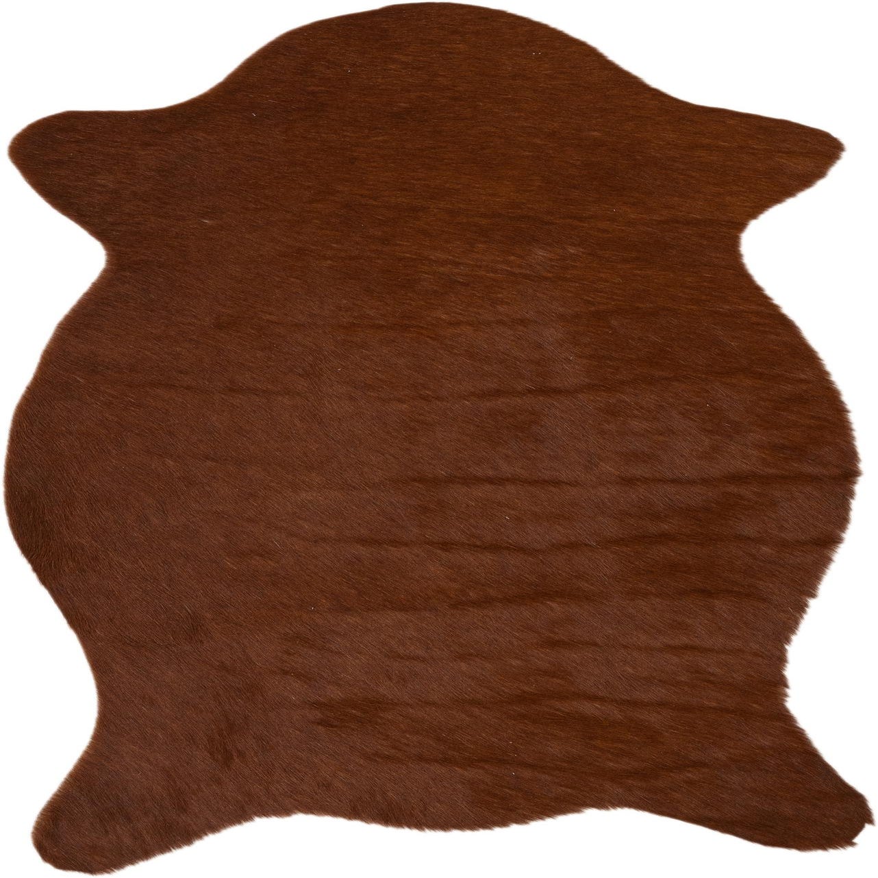 A 2x3 rectangular brown cowhide rug with a natural, irregular shape, featuring a flat, textured pile.