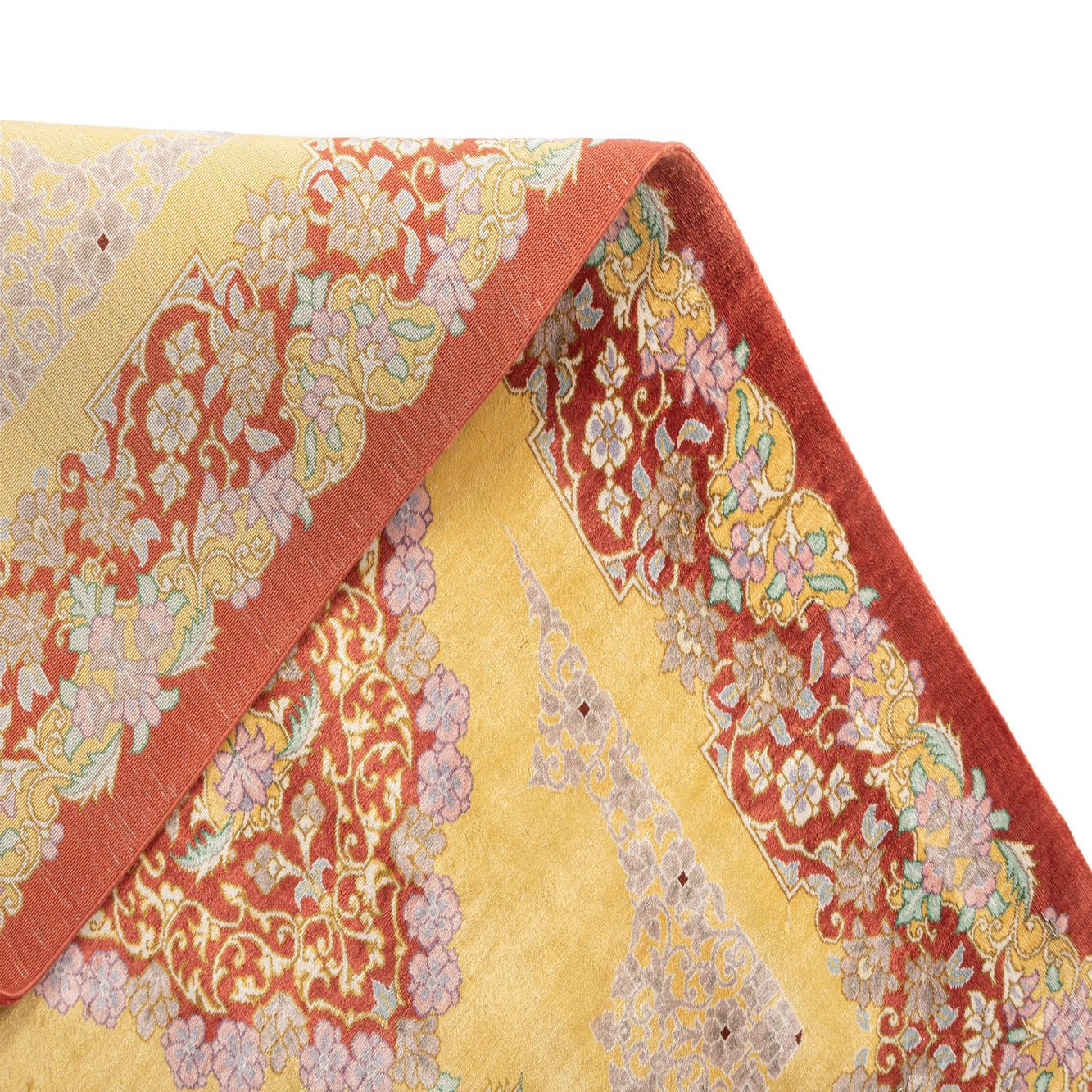 The detailed border encapsulates the majesty of traditional design, as each color is precisely positioned to enhance the overall aesthetic. The texture of the silk pile offers a soft touch, which not only adds a layer of comfort underfoot but also a subtle sheen that captures and reflects light, giving the piece a dynamic presence.