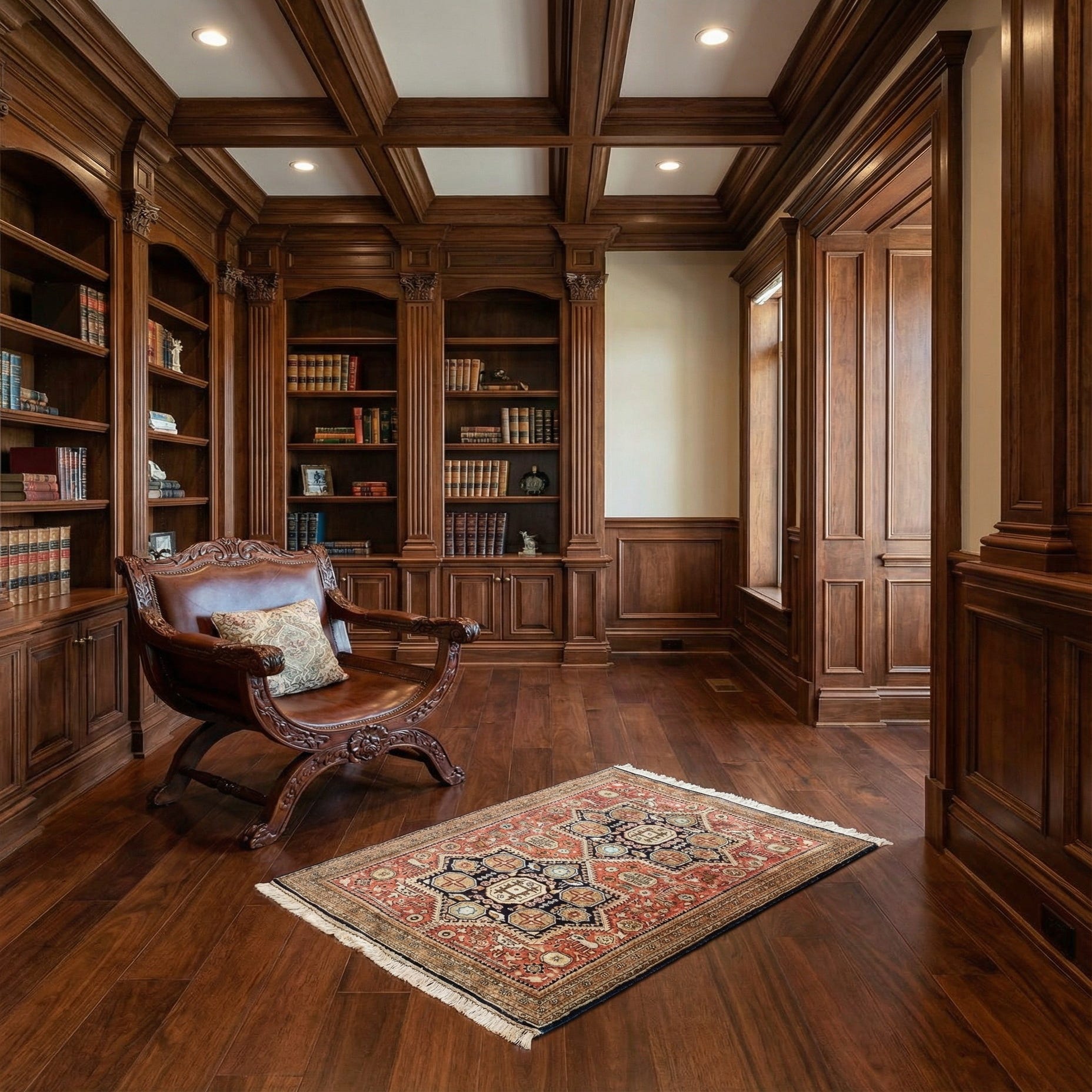 Place this piece as an entry accent or layered beneath a small writing desk or side chair where its scale and detail can be appreciated up close. It pairs naturally with warm wood tones, cognac leather or neutral upholstery and works well in both classic and transitional interiors—use it to add pattern and color to a study, hallway, or a compact seating corner. The refined texture and traditional motif also complement brass or antique metal accents, helping pull together a calm, collected room scheme.