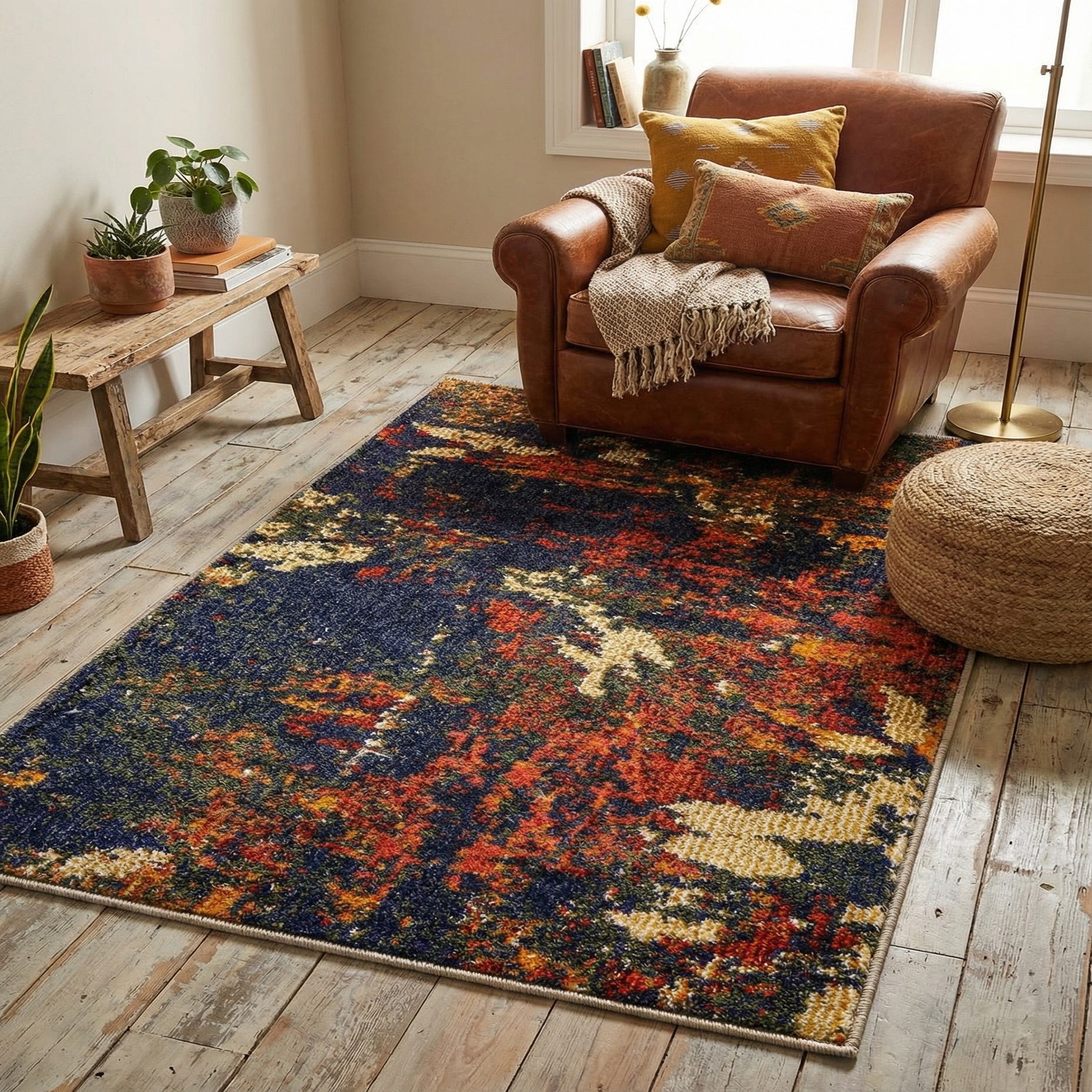 Machine-made of 100% polypropylene, the rug has a dense, low-to-medium pile that feels soft underfoot and holds a subtle texture from the cut yarns. Use it as an accent in a compact seating area, an entryway runner alternative, or beneath an accent chair to introduce color and warmth. It pairs especially well with warm wood tones, leather or matte-black metal furnishings, and eclectic or mid-century interiors that welcome a contemporary, artful touch.