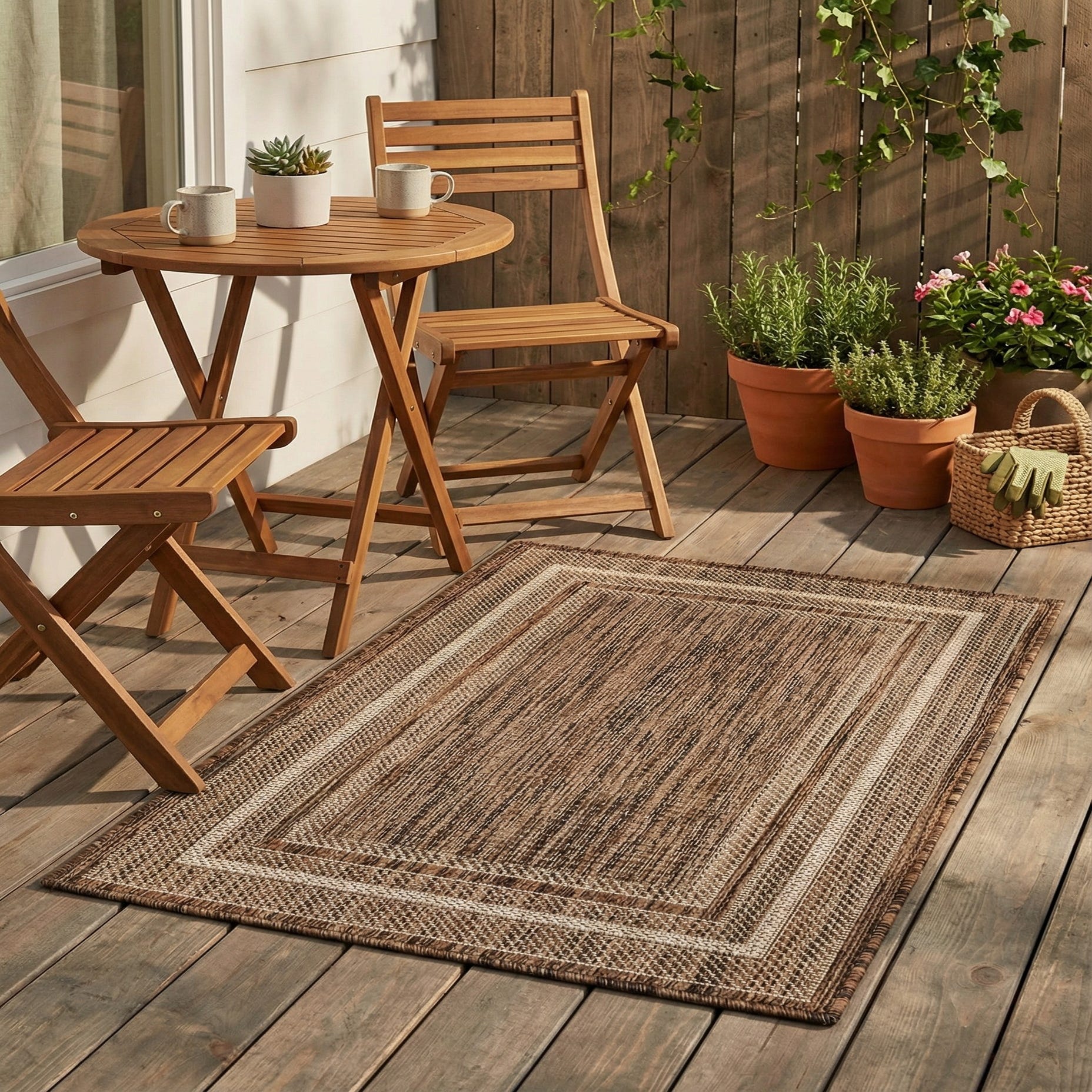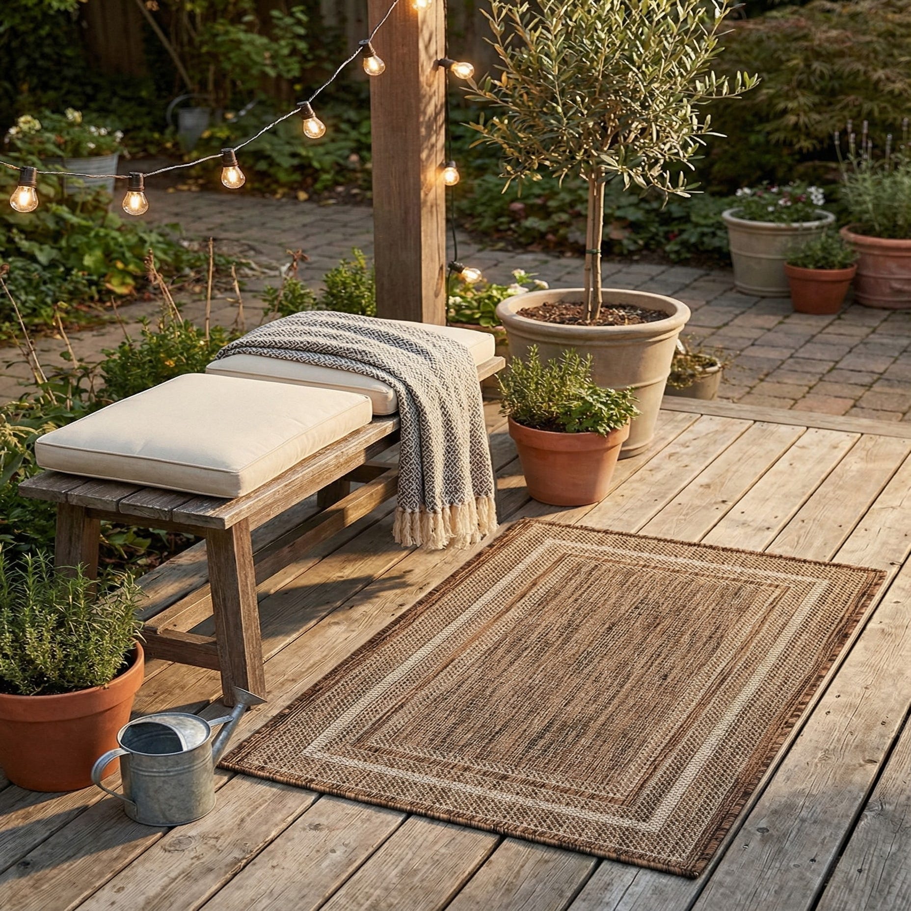 This piece works well on covered patios, entryways, balconies, or any casual indoor space where a durable, neutral anchor is needed. Pair it with natural wood furniture, rattan or wicker seating, leather accents, and linen cushions for a relaxed, layered look, or use it to ground a small bistro set or mudroom bench area. Its straightforward border and earthy palette suit transitional, rustic, coastal, and modern farmhouse schemes.