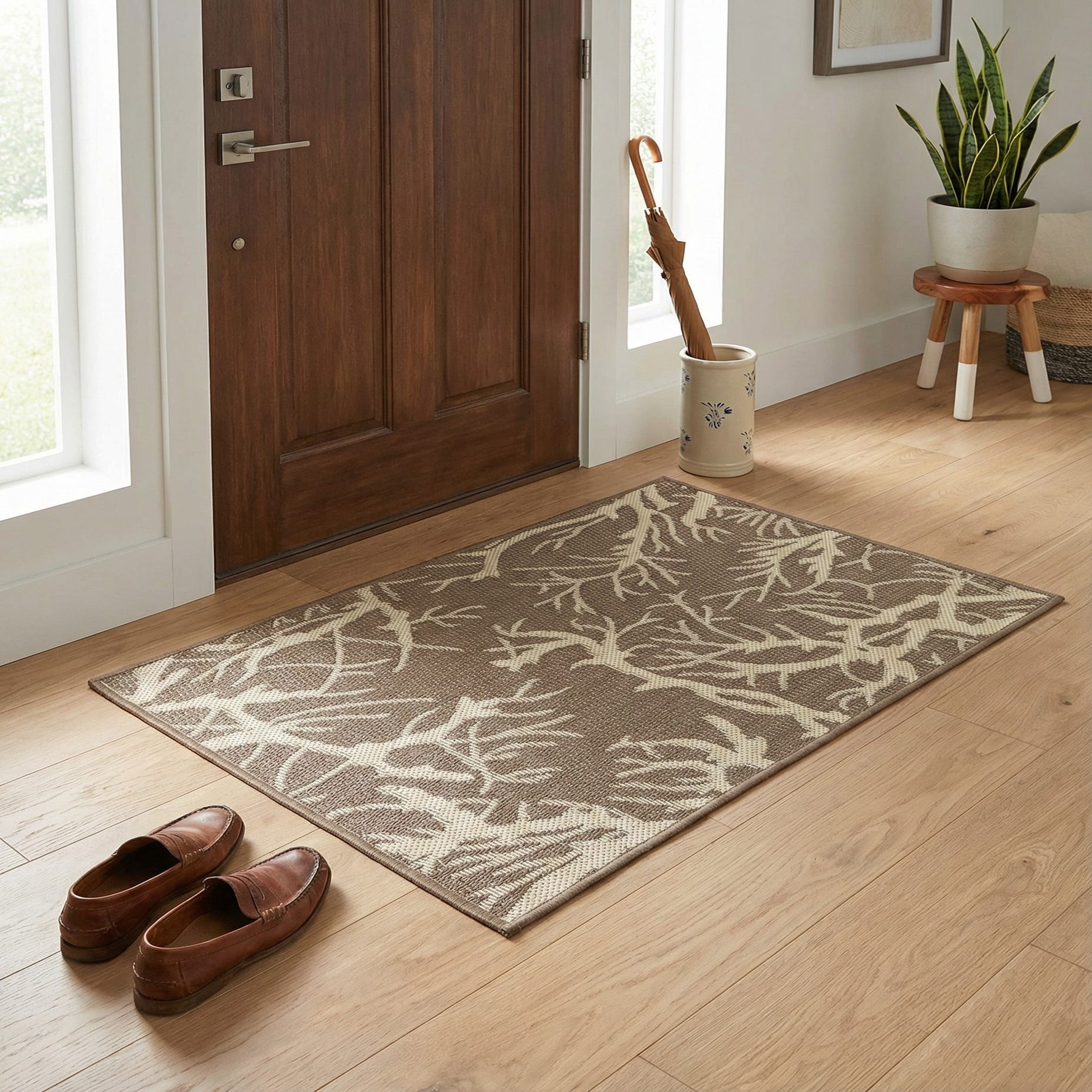 A 2x3 rectangular brown and tan indoor/outdoor rug with a modern botanical branch pattern.