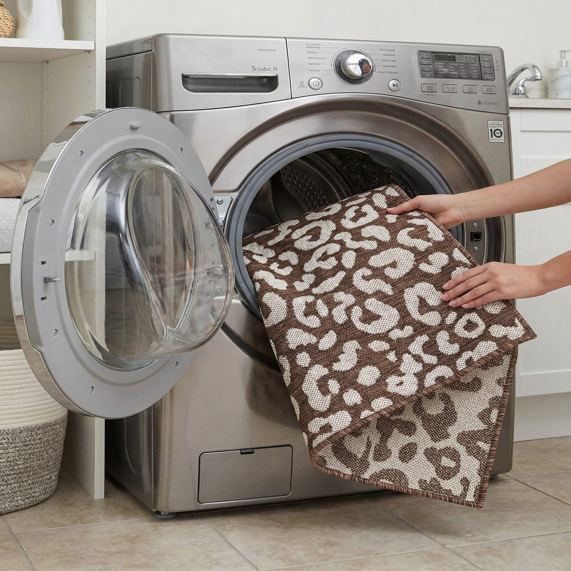 A 2x3 rectangular indoor/outdoor rug with a modern leopard print pattern in shades of brown and tan.