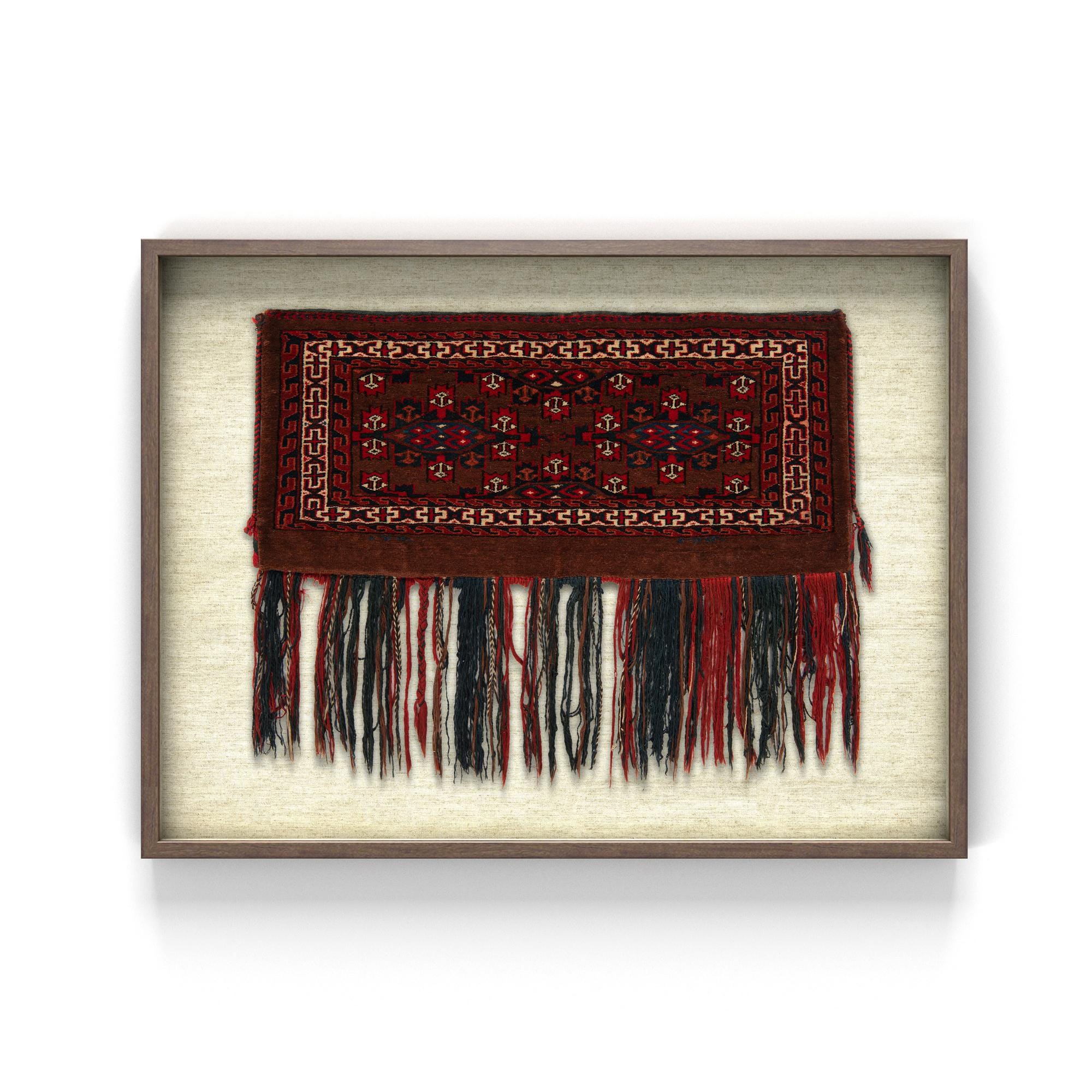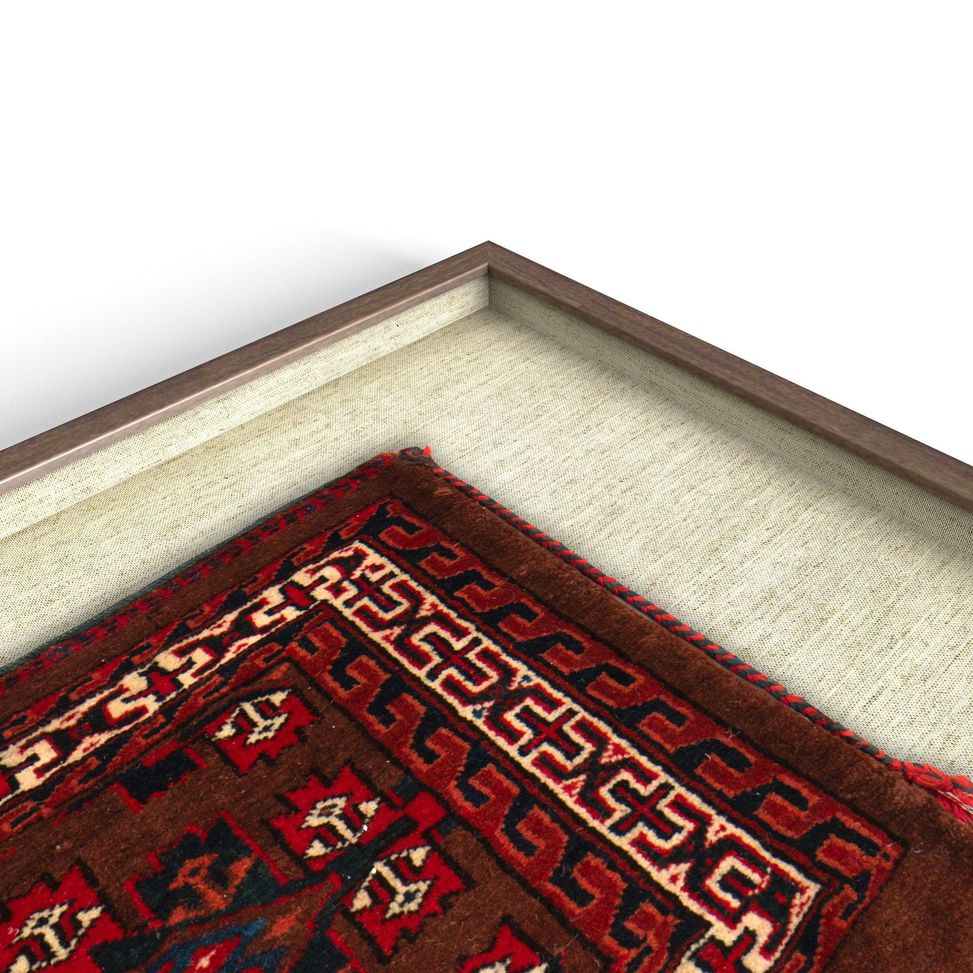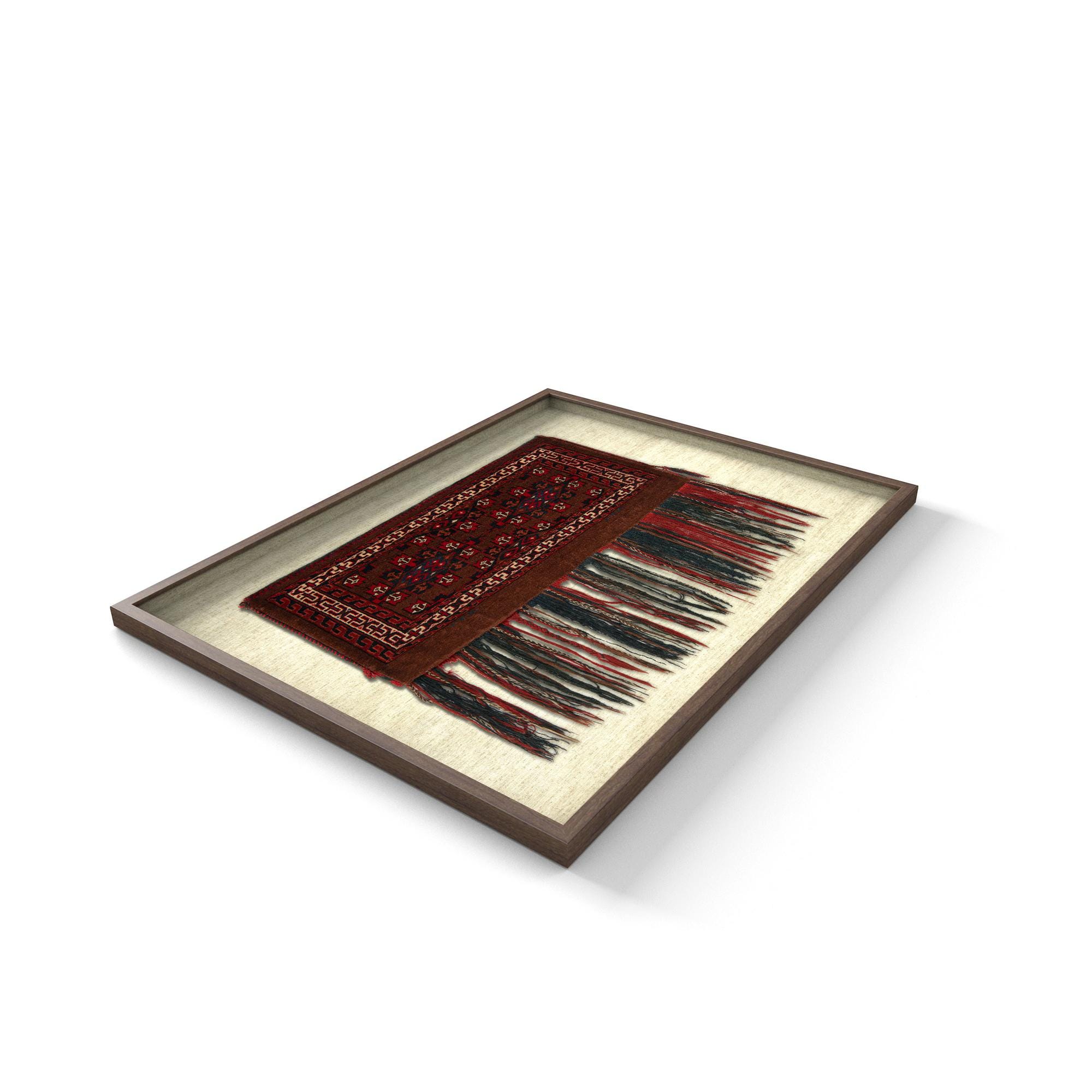 A framed 2x3 rectangular rug in shades of brown and tan, featuring a tribal pattern with red and navy accents and long fringe.