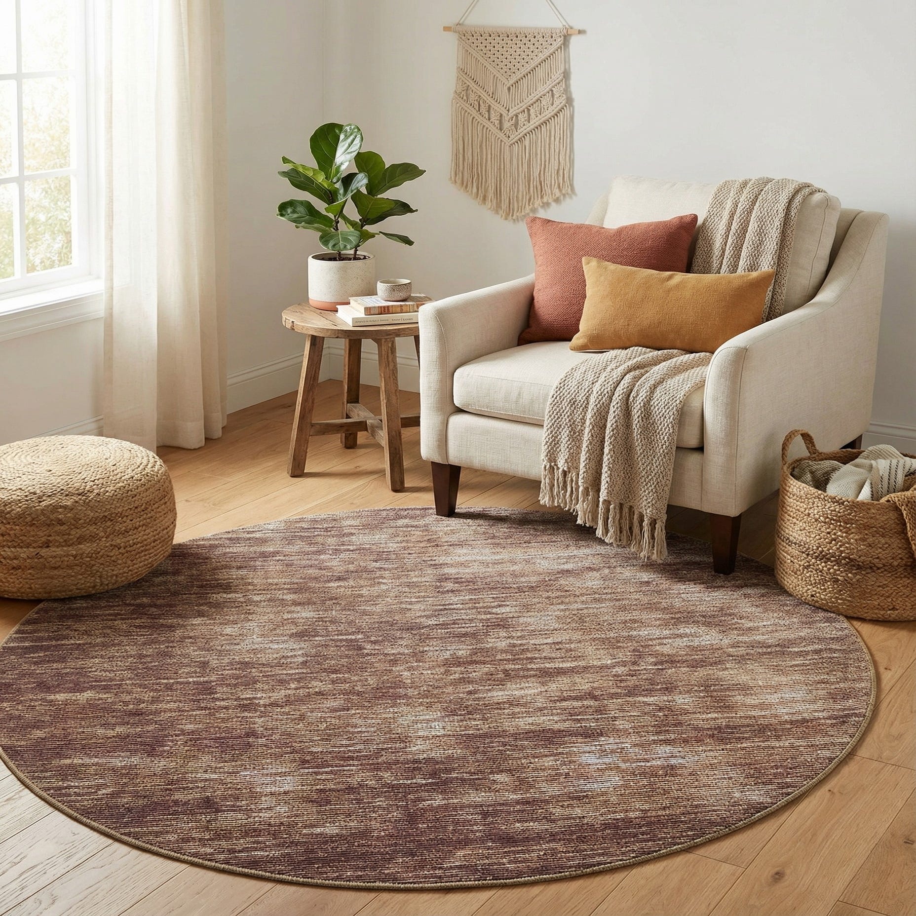 The Asha Collection offers a 3 Ft Round rug with an inviting blend of contemporary design and practical functionality. Machine-woven from 100% chenille, this piece presents a harmonious color scheme of brown, beige, and ivory, with the dominant background color being a rich brown. The rug features a subtle pattern that suggests an organic, textural appearance, reminiscent of naturally occurring variations found in stone or wood.