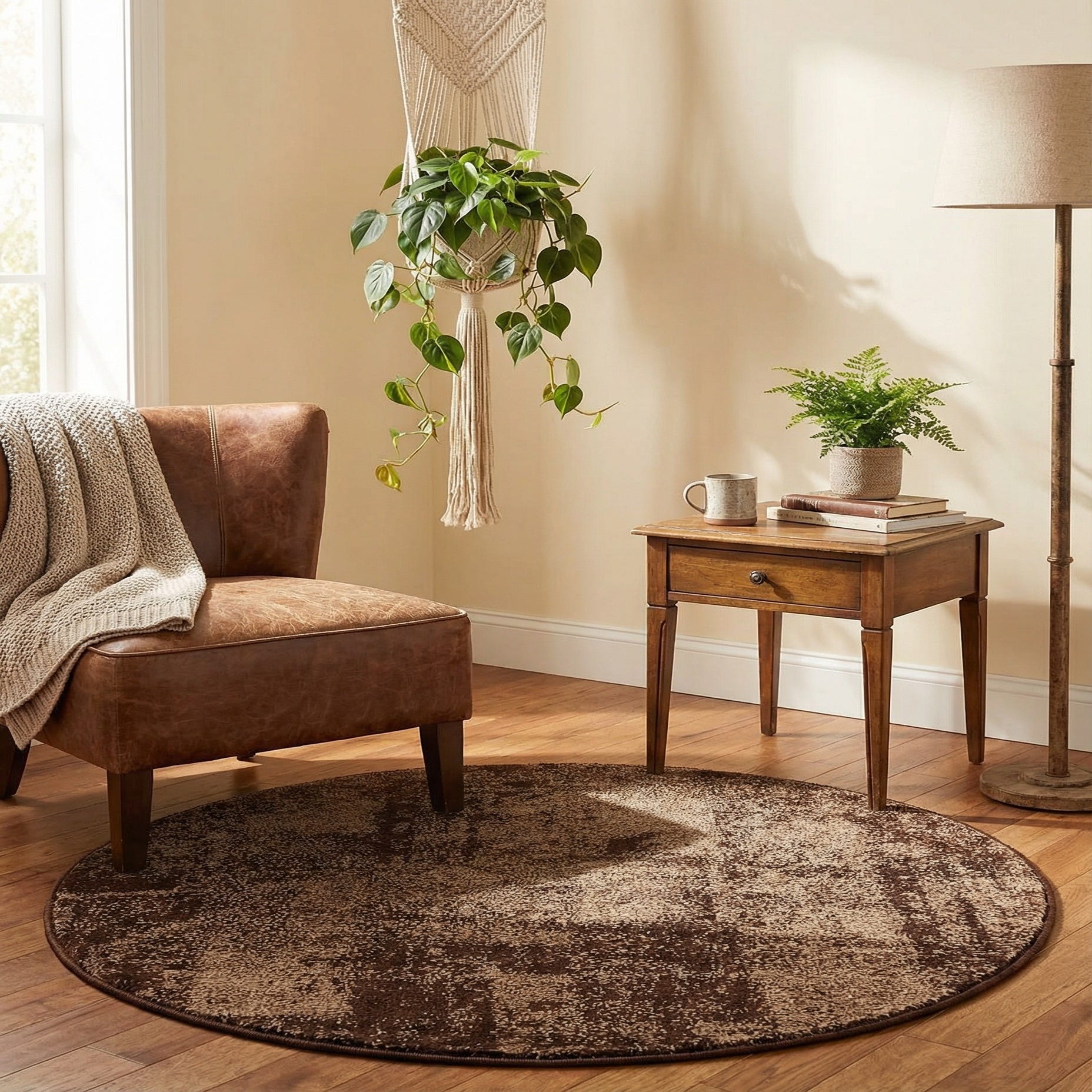 The Equinox Collection presents a 3 Ft Round rug crafted with machine-woven 100% polypropylene, offering a durable and easy-to-maintain floor covering. This rug features a rich brown background with an abstract pattern in varying shades of brown, beige, and light brown, which creates a subtle yet visually engaging element in any room. The texture is smooth to the touch, providing a comfortable underfoot experience.