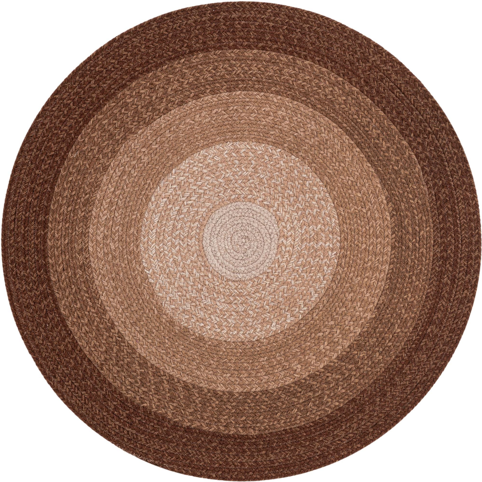 Hand-braided from 100% wool, this round rug features concentric braided rings that move from a light brown center to a deeper brown border. The brown background anchors the design while the light brown highlights woven into the braids create subtle tonal variation. The braided construction gives the surface a tactile, sculpted feel—firm and textured underfoot with the natural softness and spring of wool fibers.