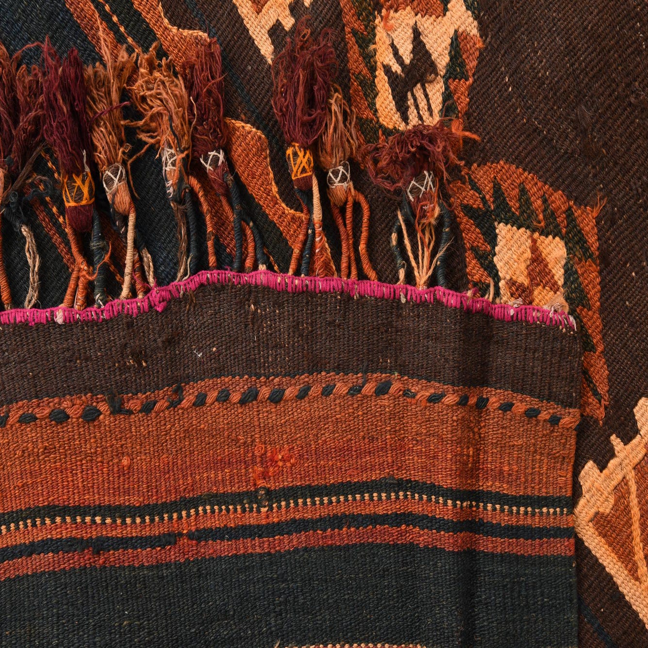 Primary color is Brown. Colors in this rug include: Brown, Beige, Black, Light Brown, Orange, Purple.