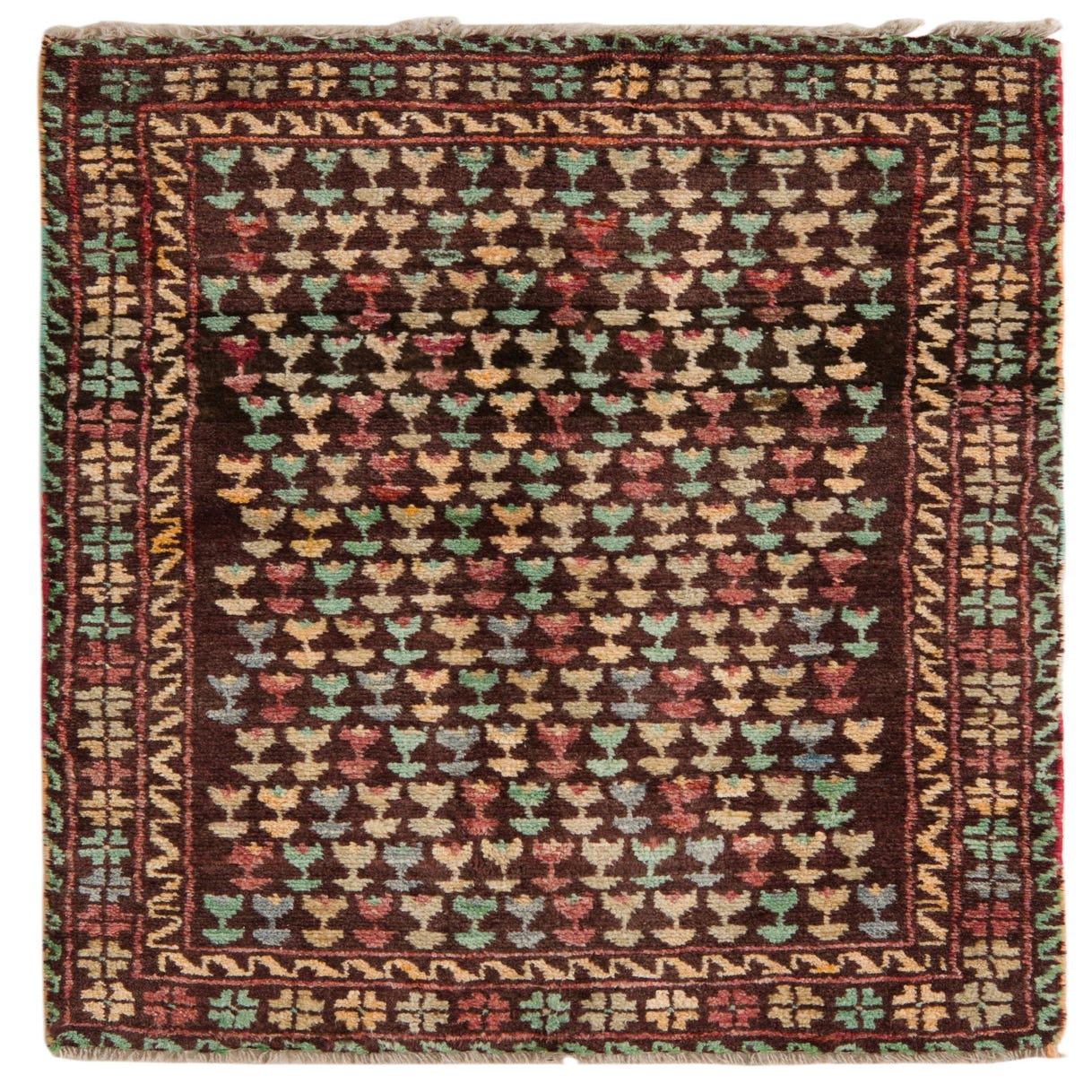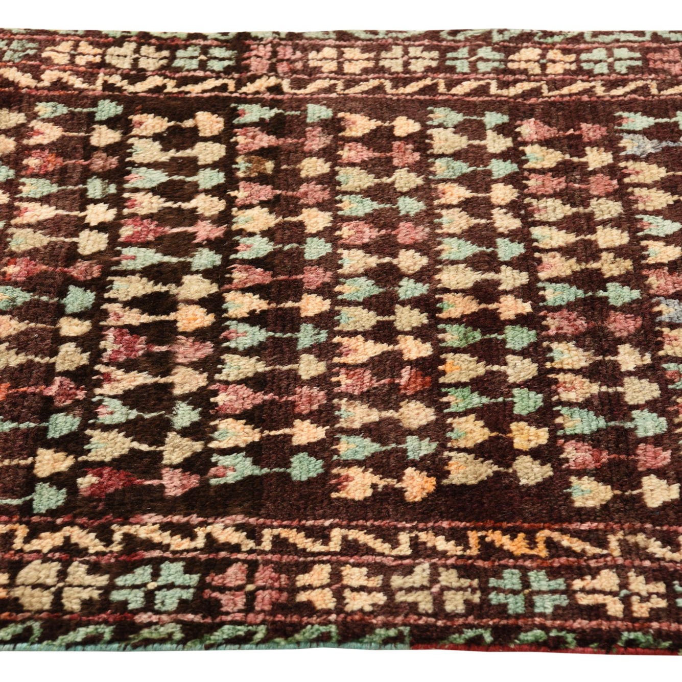A 3x4 rectangular Balouch rug with a dark brown field featuring colorful tribal motifs and a patterned border.