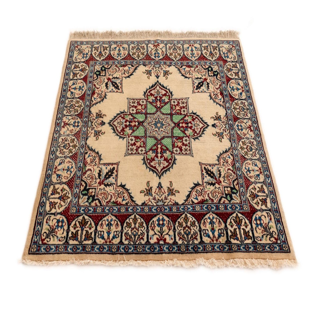 Perfect for a variety of interior design scenarios, this rug could serve as a focal point in a small seating area, under a coffee table, or as an elegant accent in a larger room with traditional furnishings. Its timeless pattern and rich colors lend themselves well to classic decor styles, but can also complement contemporary spaces that embrace a mix of textures and cultural elements.