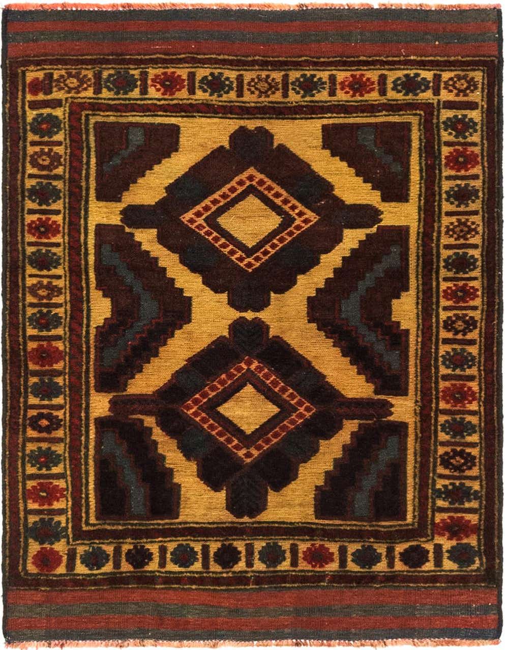 A 3x4 rectangular Sumak rug with a traditional tribal medallion pattern in browns, tans, and hints of red and blue.