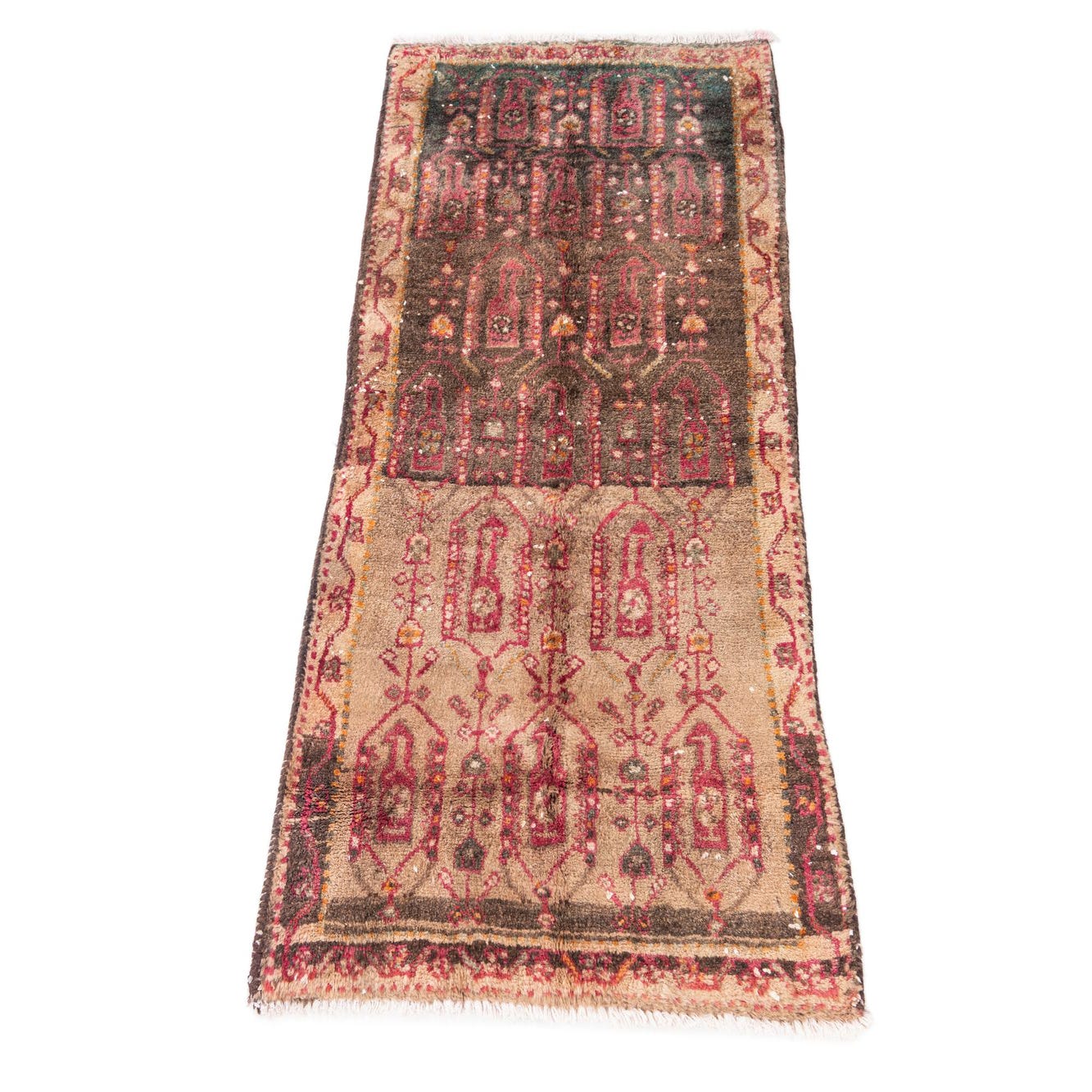 This rug would integrate seamlessly into interiors that appreciate the charm of vintage elements, such as classic, traditional, or eclectic environments. Its warm tones and intricate design make it a natural pairing for spaces featuring wood furniture, antique pieces, or rich leather accents. In a contemporary setting, this rug could serve as a striking contrast piece, adding depth and a tactile element to a modern, minimalist decor.