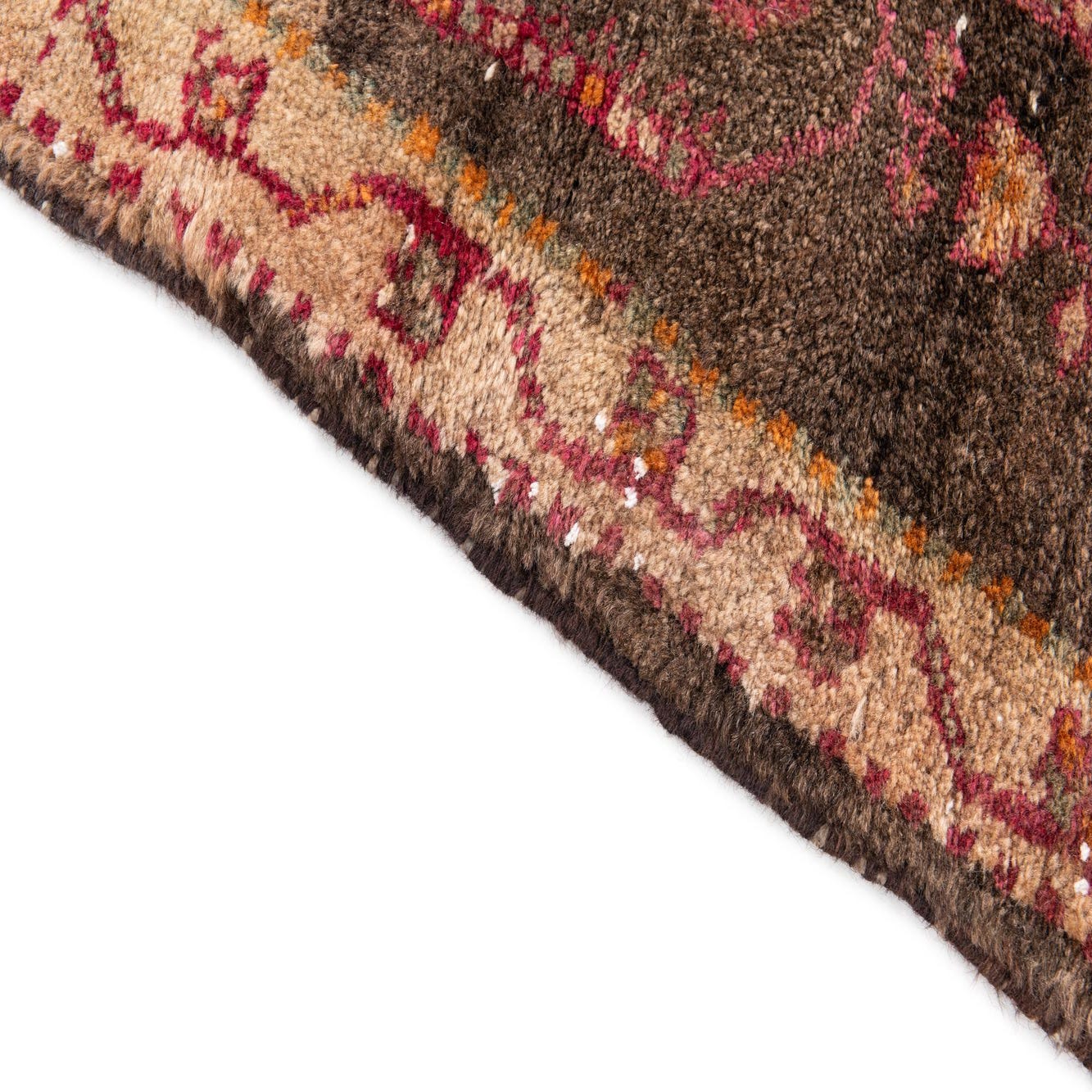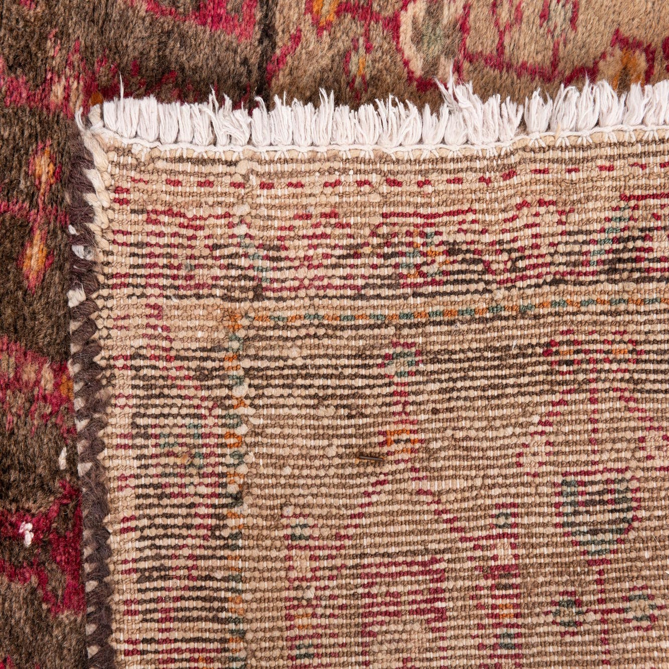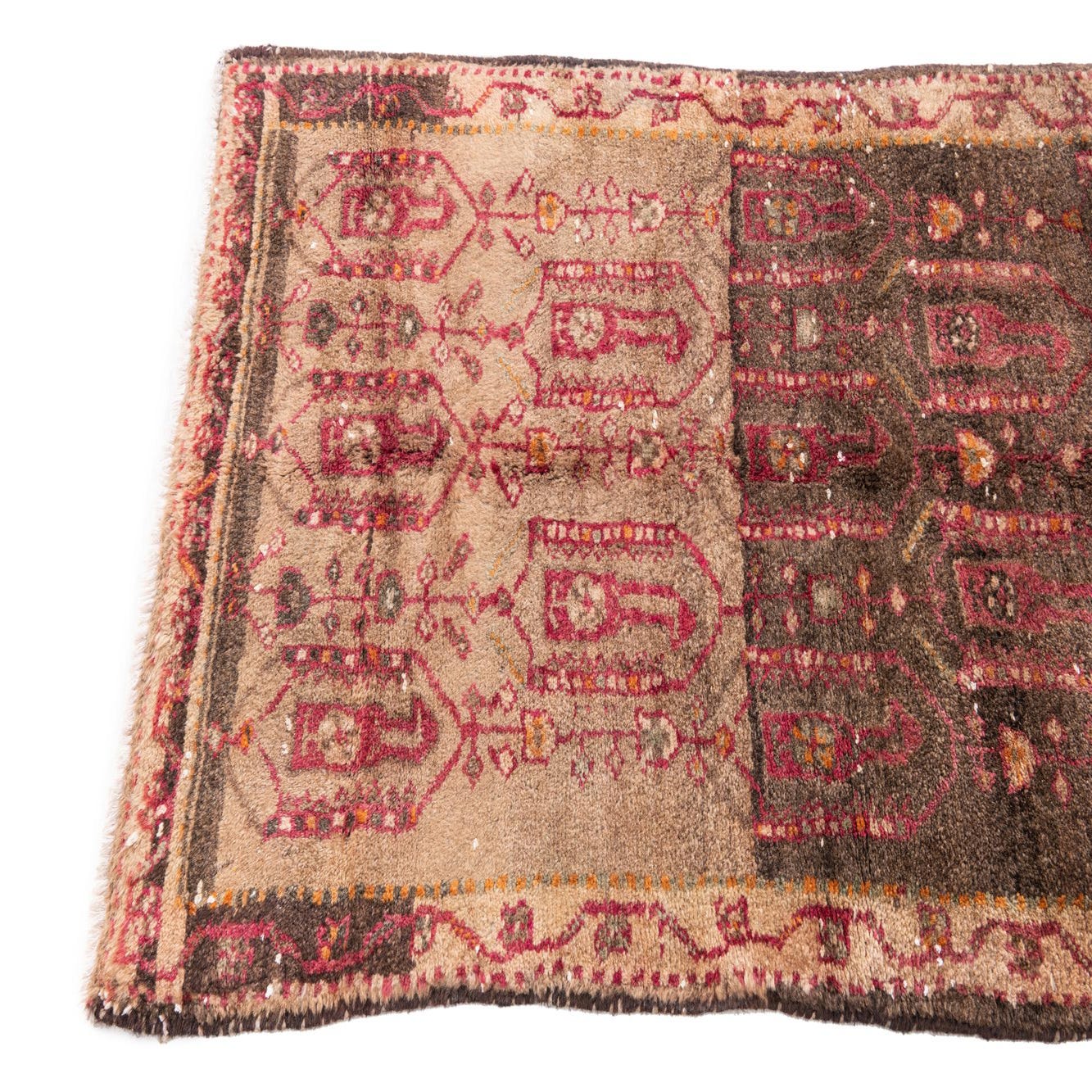 This Ultra Vintage collection rug showcases the timeless beauty of hand-knotted wool, lending a sense of history and artisanal craft to its design. At a versatile size of 3x4, the rug features a balanced array of geometric motifs and stylized botanical elements that create an engaging, symmetrical pattern. The color palette includes grounding brown as the background, complemented by warm beige, rich red, and accents of black and light brown, offering a harmonious blend that can anchor a space with sophistication.
