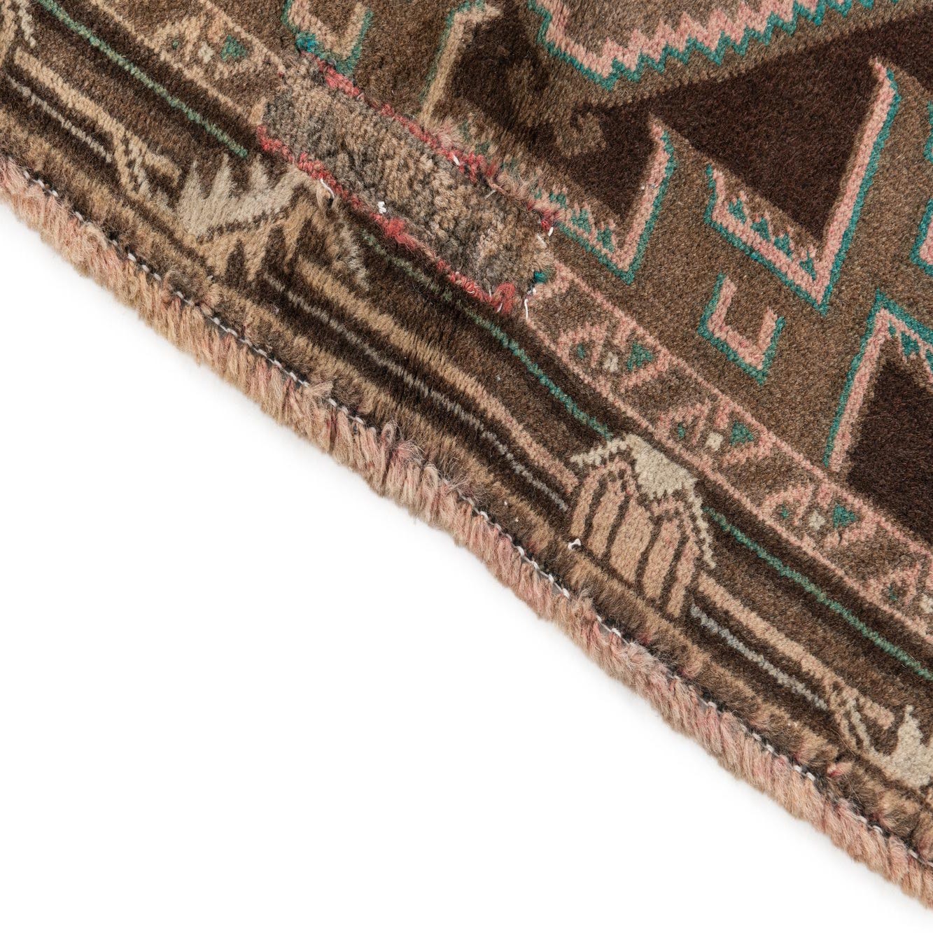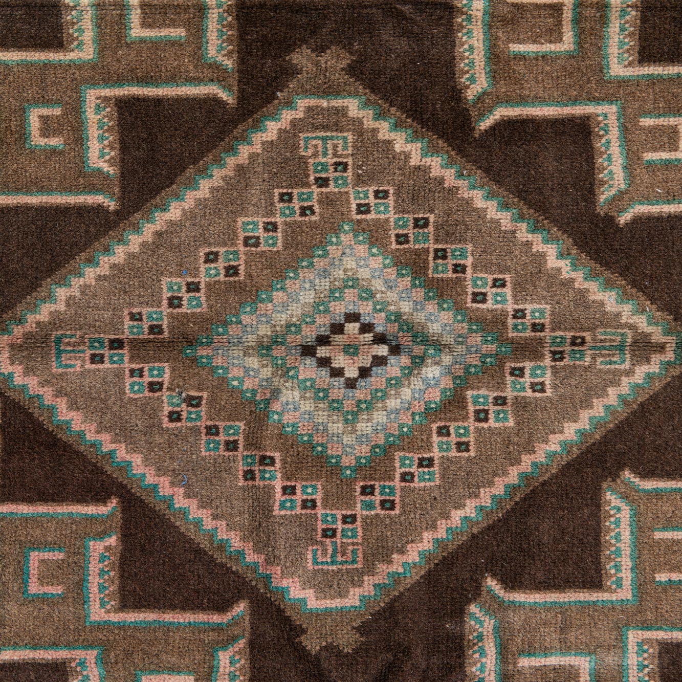 The Ultra Vintage Hand Knotted rug, sized at a versatile 3x4, is a testament to meticulous craftsmanship and enduring style. Crafted from 100% wool, this rug showcases a symmetrical arrangement of geometric and angular motifs, creating a dynamic visual impact. The pattern weaves through natural hues of brown, light brown, green, and ivory, anchored by a rich brown background, which adds a cozy warmth to any space it adorns.