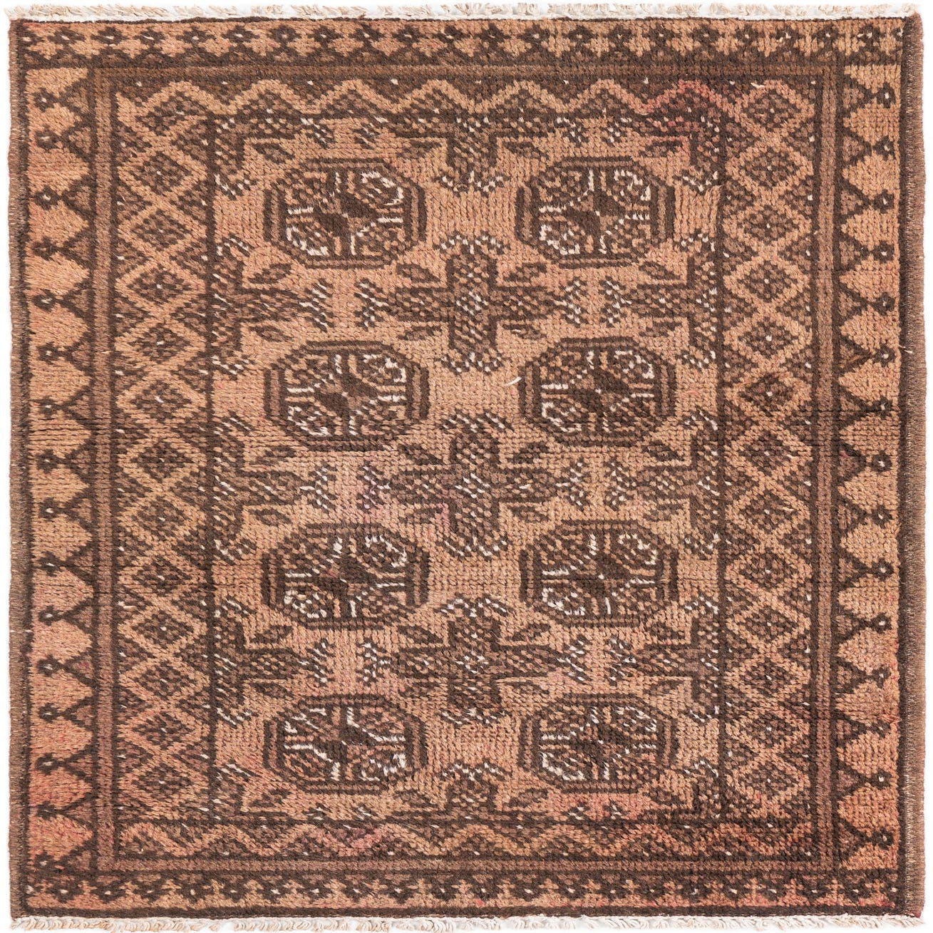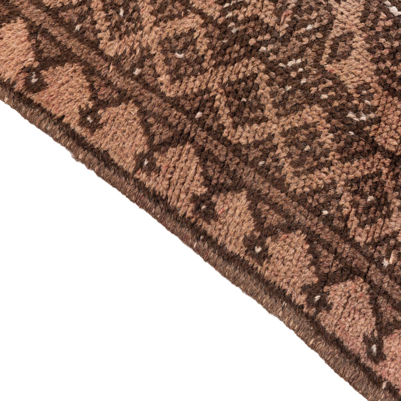 This Ultra Vintage rug is a hand-knotted piece meticulously crafted from 100% wool, offering a durable and timeless addition to any interior space. The design features a series of geometric motifs, set within a repeating pattern, creating a cohesive and harmonious aesthetic. Its color palette consists of a rich brown background with ivory accents, providing a warm and inviting ambiance.