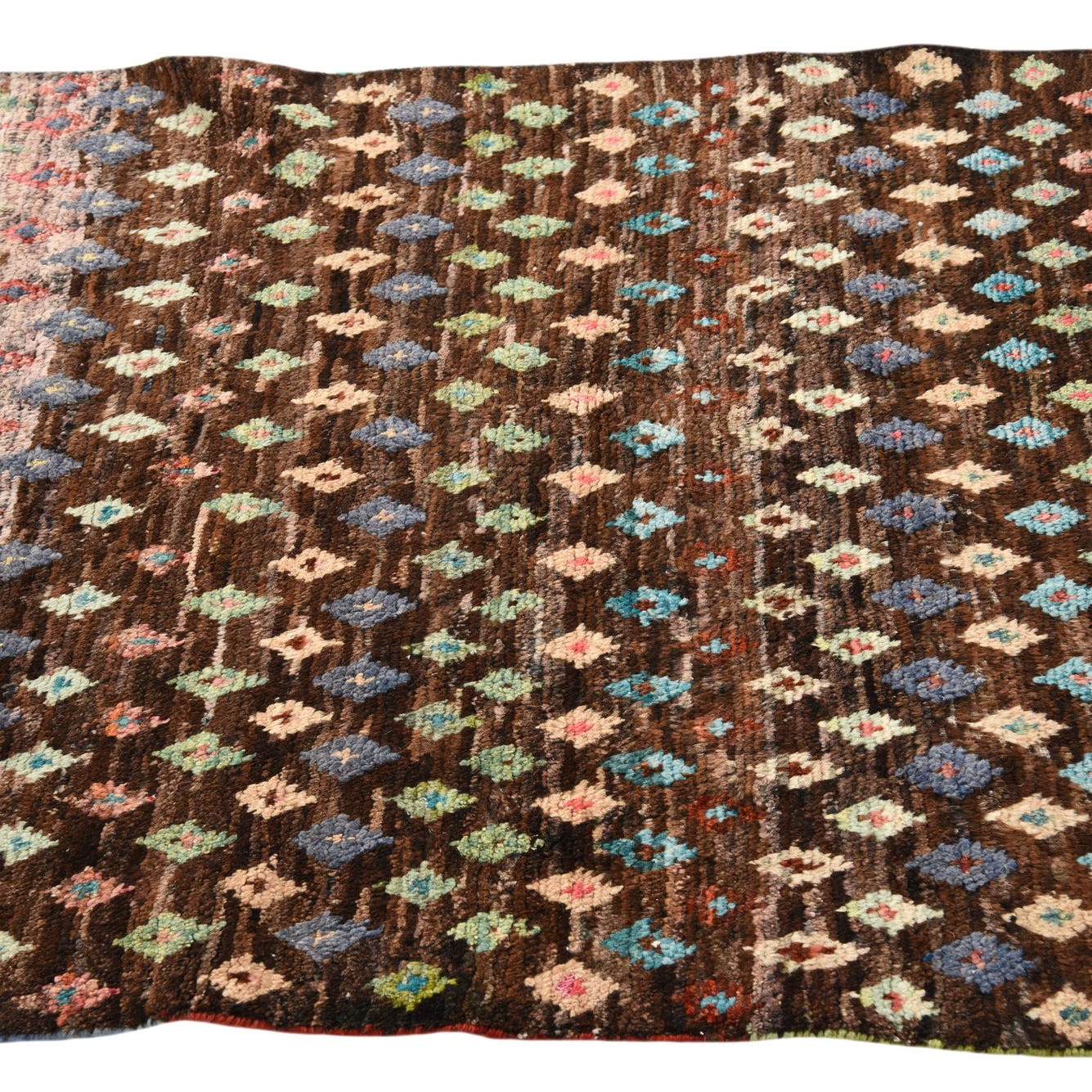 A 3x5 rectangular Balouch rug with a brown and tan base, featuring a tribal, modern, and abstract pattern of colorful diamond shapes in blues, greens, pinks, and creams.