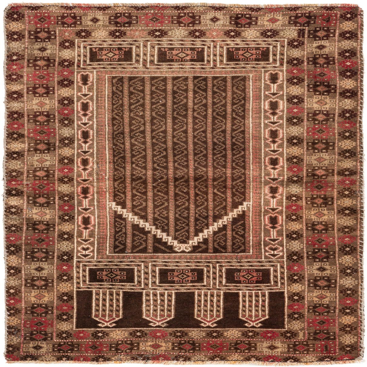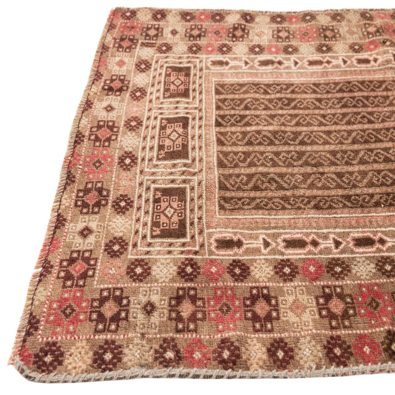 A 3x5 rectangular Balouch wool rug with tribal and oriental patterns in shades of brown, tan, and red.