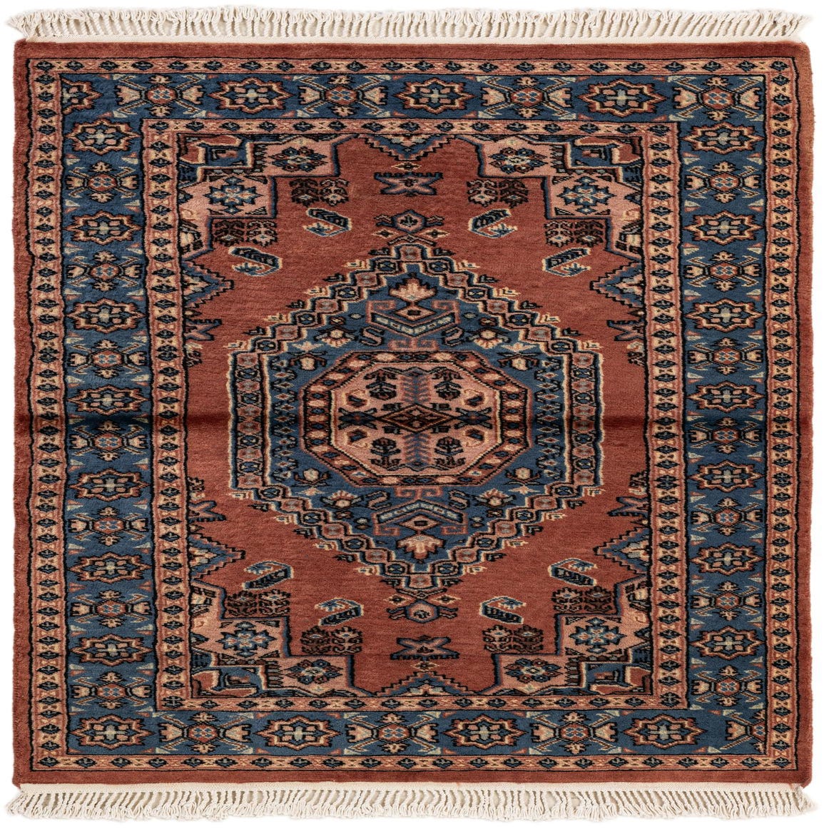 A 3x5 rectangular Bokhara rug with a traditional tribal medallion pattern in shades of brown, tan, and blue, featuring fringe.