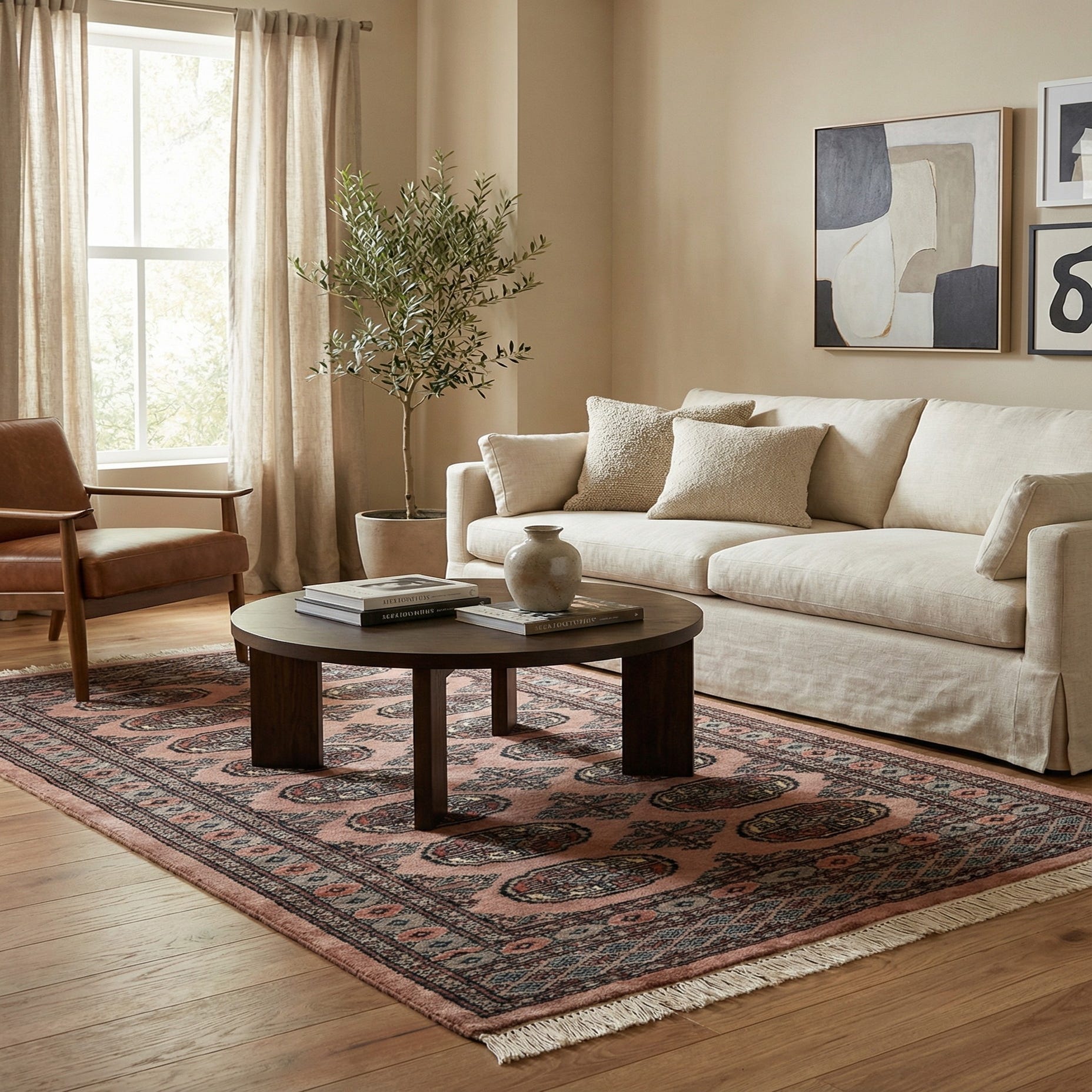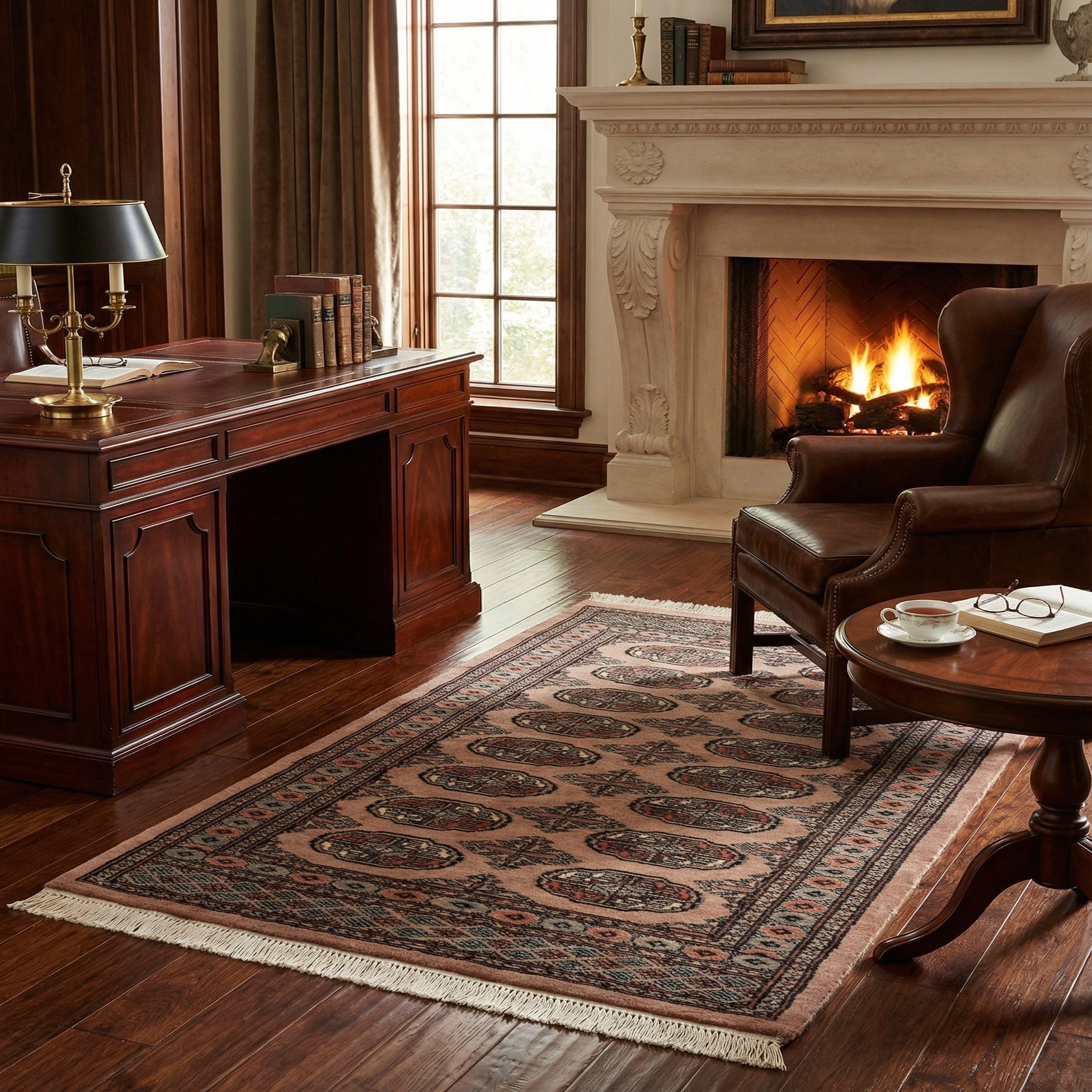 A 3x5 rectangular Bokhara wool rug in shades of brown and tan, featuring a traditional tribal pattern with geometric medallions and a detailed border, suitable for an entryway.