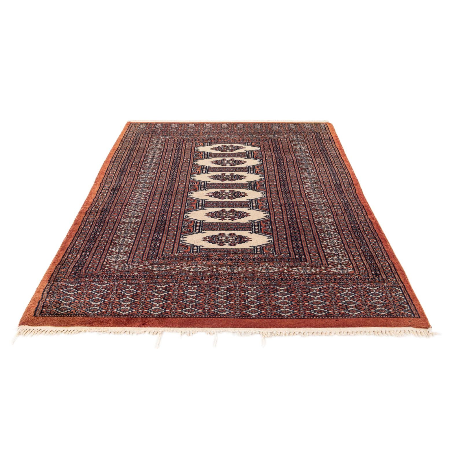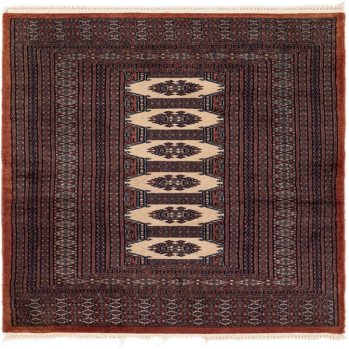 A 3x5 rectangular Bokhara wool rug featuring traditional tribal patterns in shades of brown and tan, with a central medallion design.