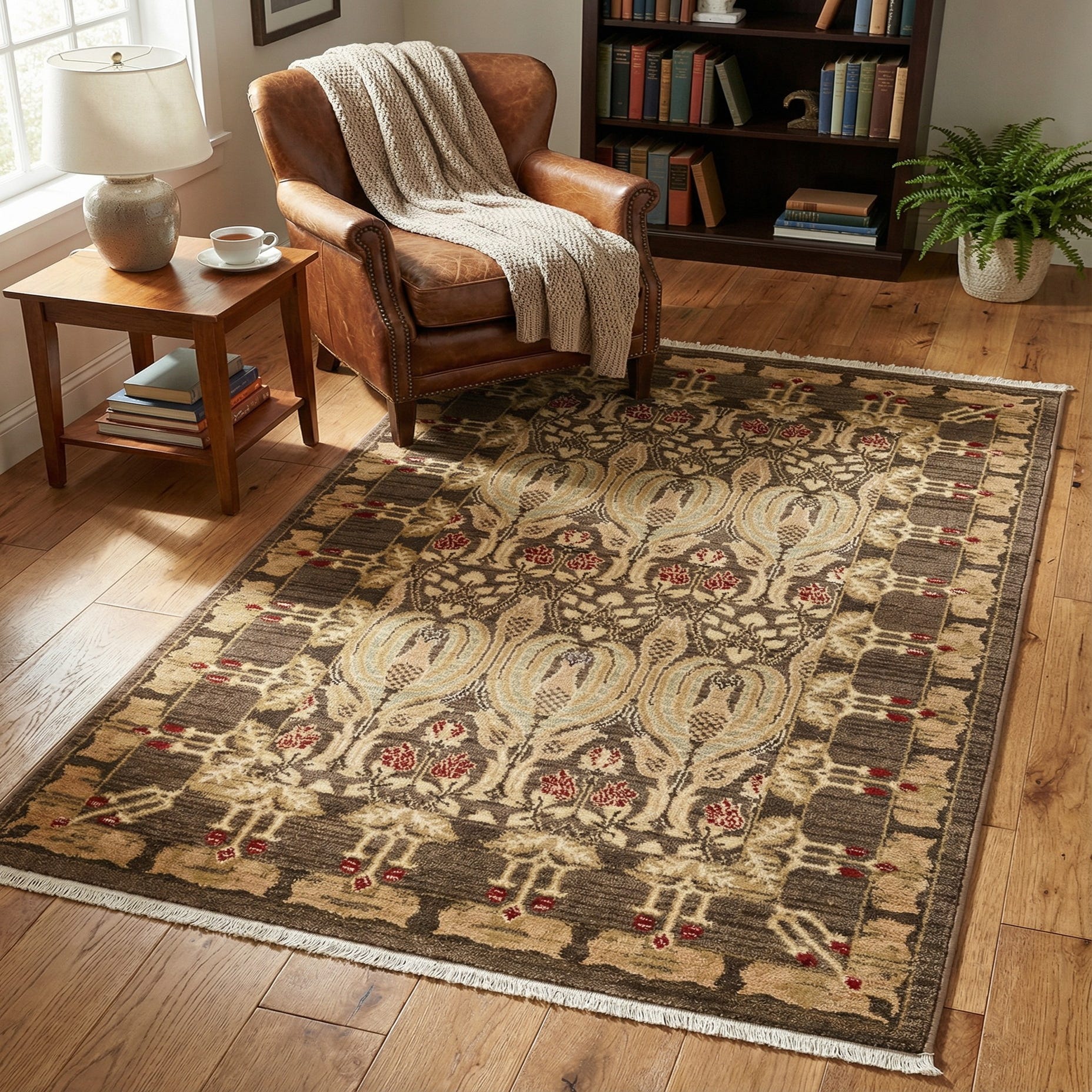 The surface has a low, tightly woven cut pile that feels smooth and slightly cushioned underfoot, with enough texture to show crisp motif definition. Place it beneath a small coffee table or layer it in an entry or reading nook to bring warmth and pattern without overwhelming the space. It pairs well with leather or wood furniture, warm neutral upholstery, and accent pillows or art in rust and olive tones, and it also complements transitional and traditional interiors when you want a grounded, classic foundation.