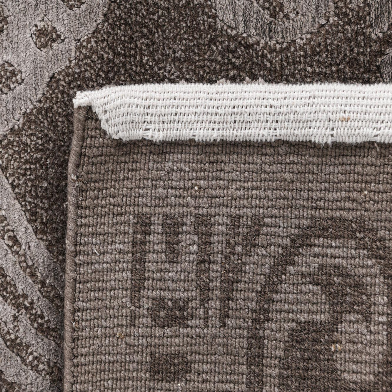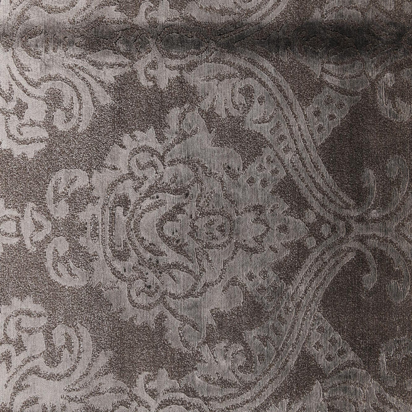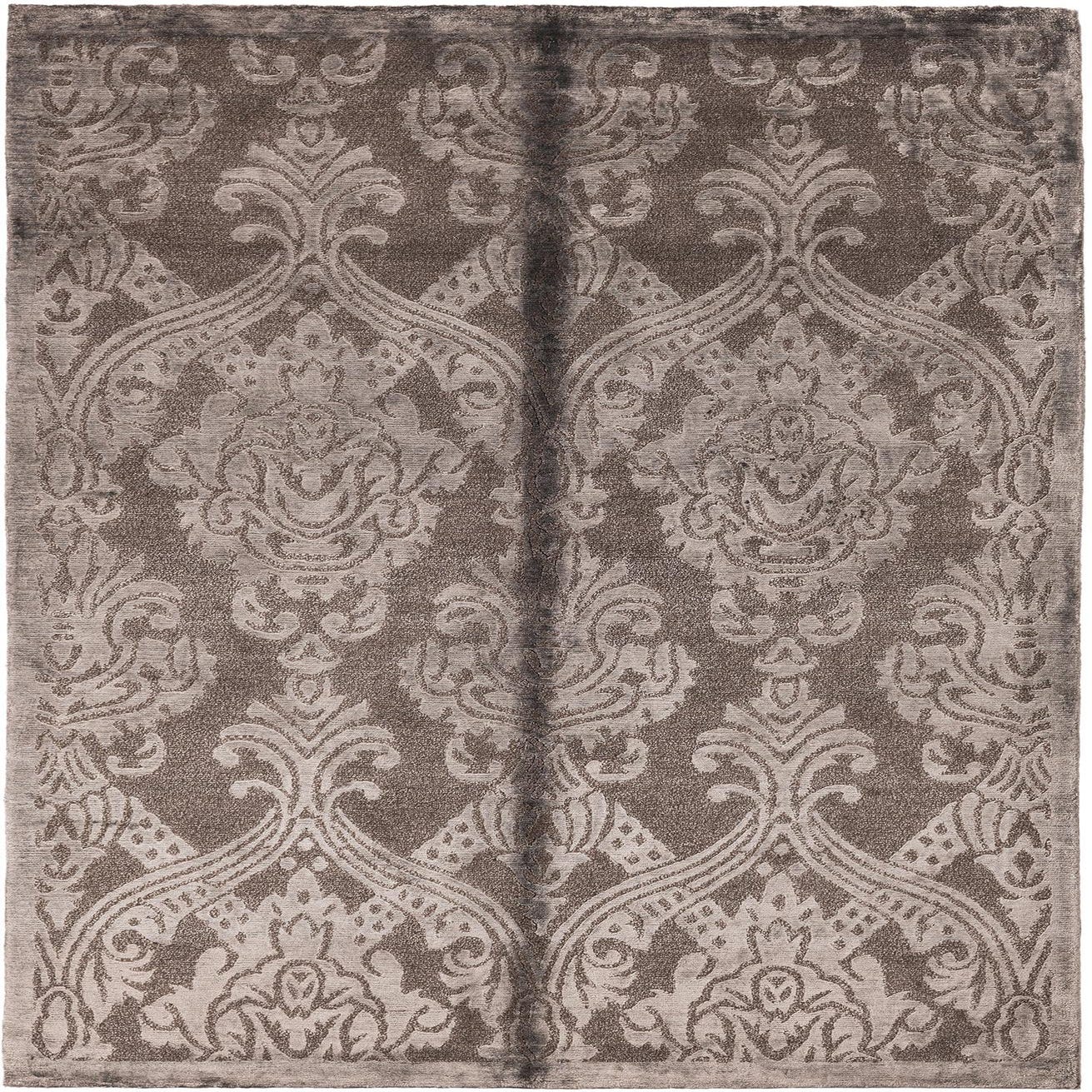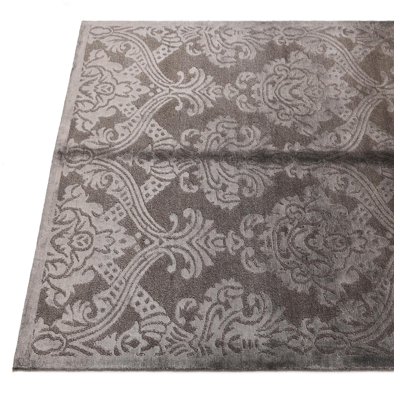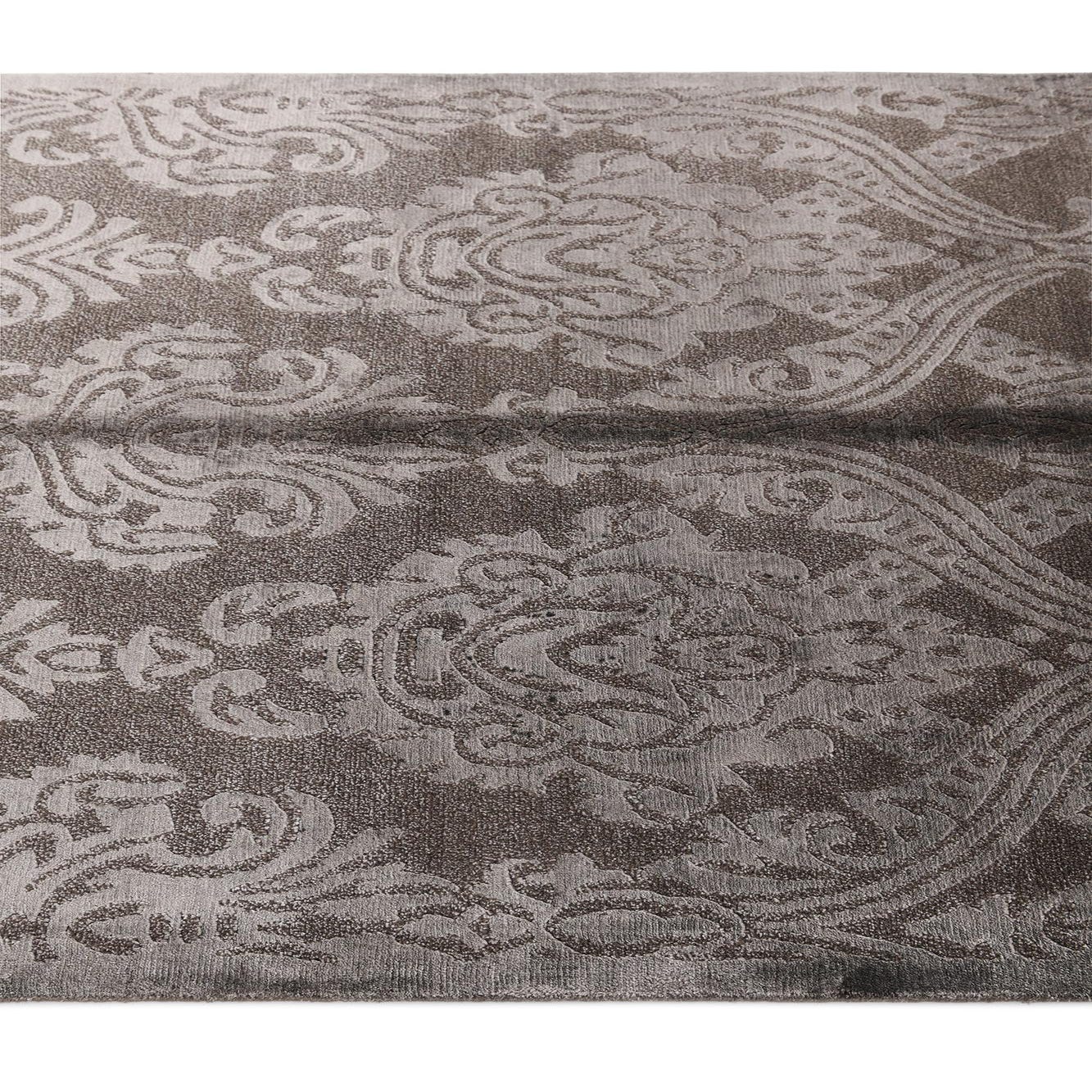 The Darya collection offers a refined take on traditional motifs, with this particular 3x5 wool and cotton handmade rug presenting a brown background accented by a sophisticated pattern in complementary shades of gray. The design features intricate florals and elegant scrollwork, creating a sense of timeless elegance.