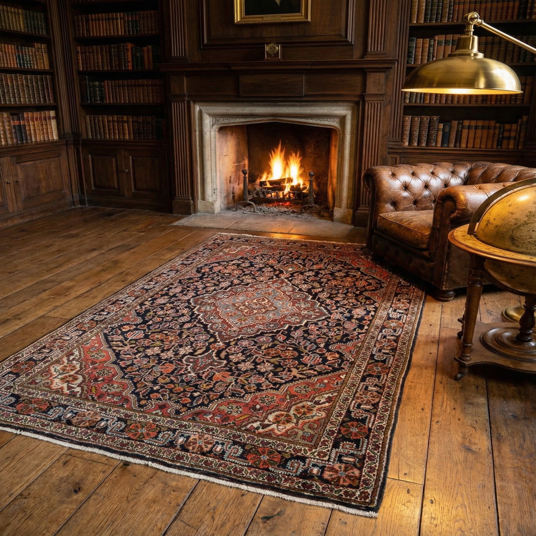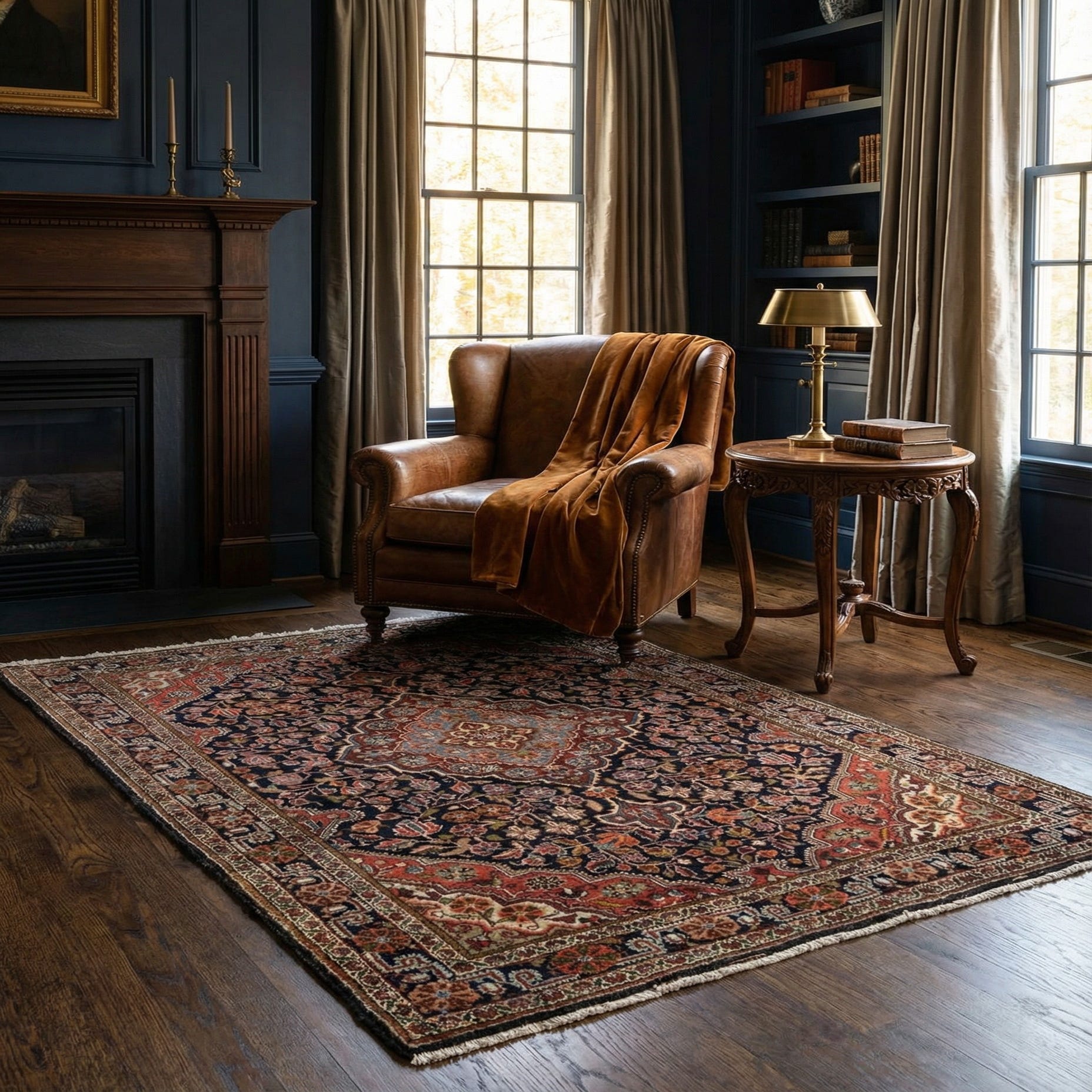 The construction of this rug showcases the artisanal quality and yields a dense, plush texture that is both comfortable underfoot and durable. Its versatility allows it to serve as a captivating centerpiece in a variety of interior design scenarios, from an elegant traditional living room or an office with classic wood furniture to a well-curated eclectic space where it can complement both modern and antique elements.