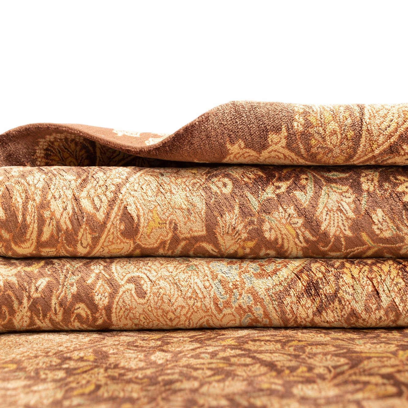 A luxurious 3x5 rectangular Ghom Silk Persian rug in rich browns and tans, featuring intricate floral and medallion patterns.
