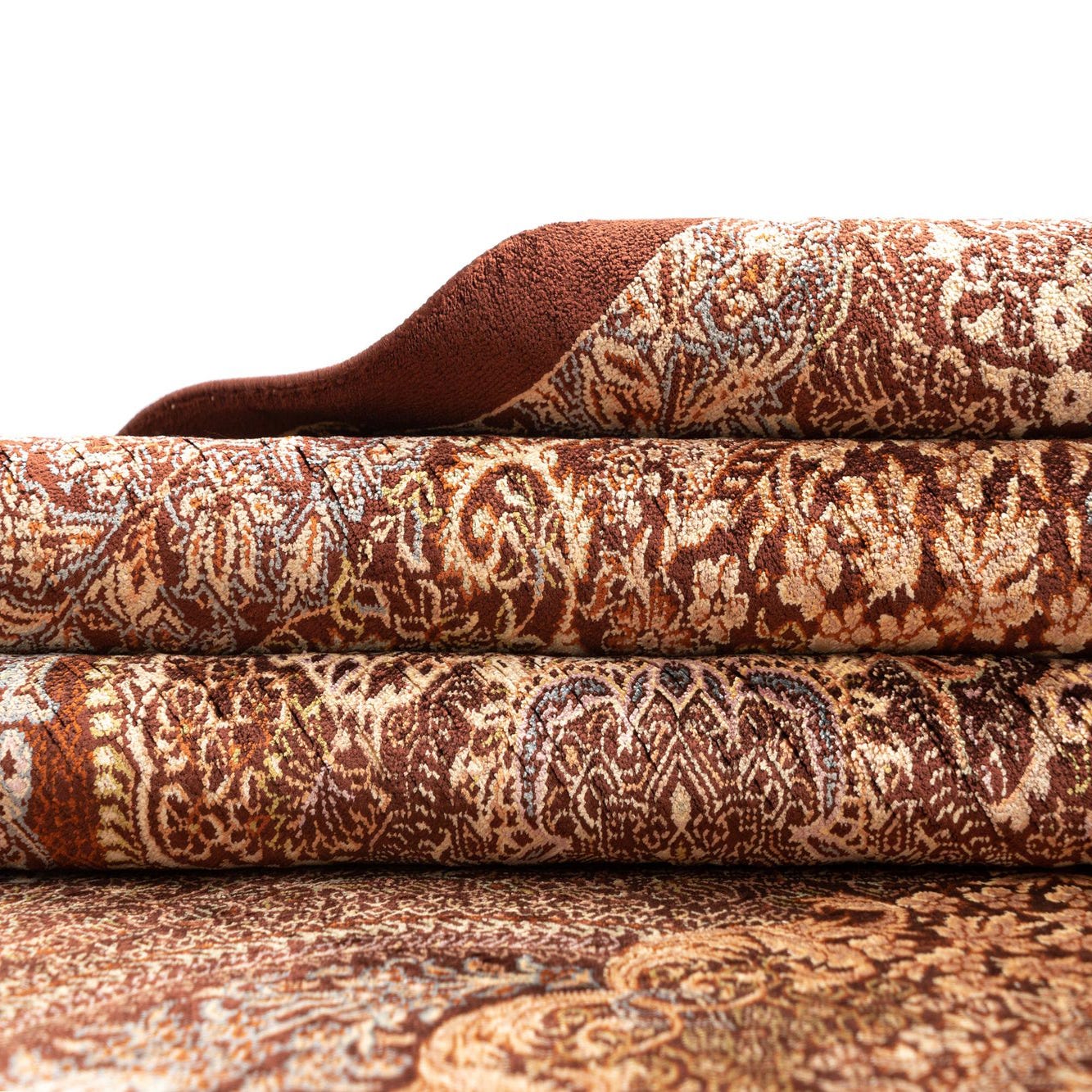 A traditional medallion layout unfolds across a rich brown ground, surrounded by dense floral arabesques, scrolling vines and finely worked corner motifs. Light brown and beige tones layer into the pattern for warmth, while touches of light blue, olive and purple add subtle cool and verdant accents. The borders are tightly detailed, framing the field with compact floral repeats that guide the eye toward the central medallion. Hand-made of silk, the pile is low and smooth; under your fingertips the silk feels cool and satiny and gives the pattern a soft, muted sheen that catches light without overpowering the room.