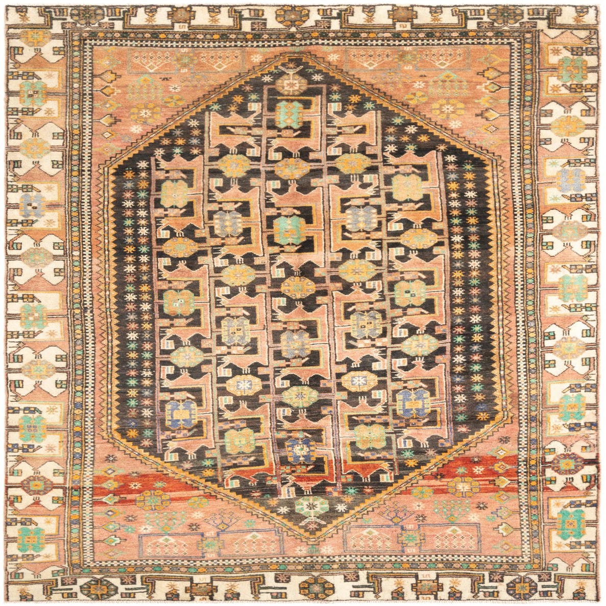 A 3x5 rectangular Hamedan tribal wool rug featuring a central black medallion with colorful geometric patterns, surrounded by a peach-brown field and a cream border.