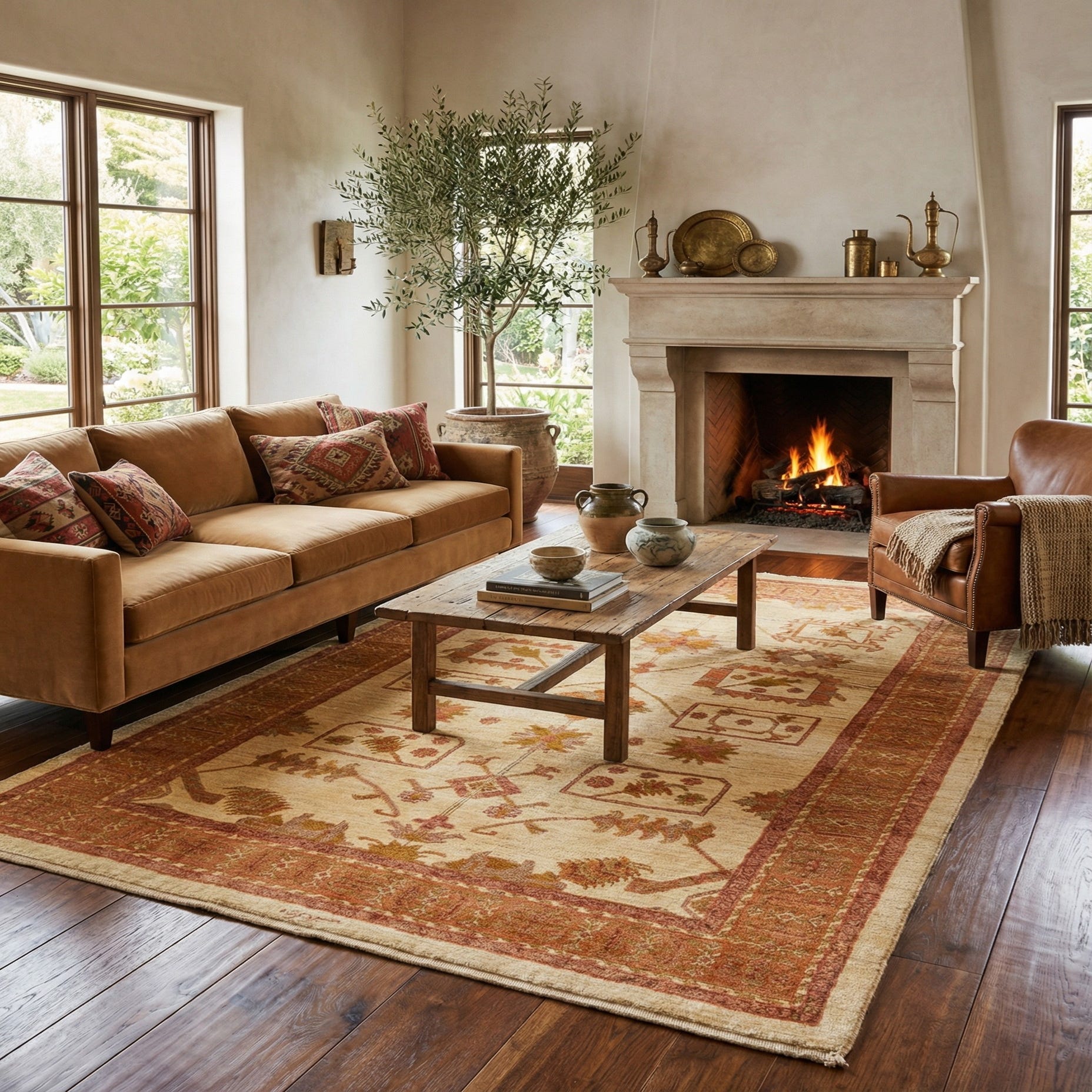 A 3x5 rectangular Kashkuli Persian rug with a tan field and intricate brown and orange traditional patterns, ideal for an entryway.