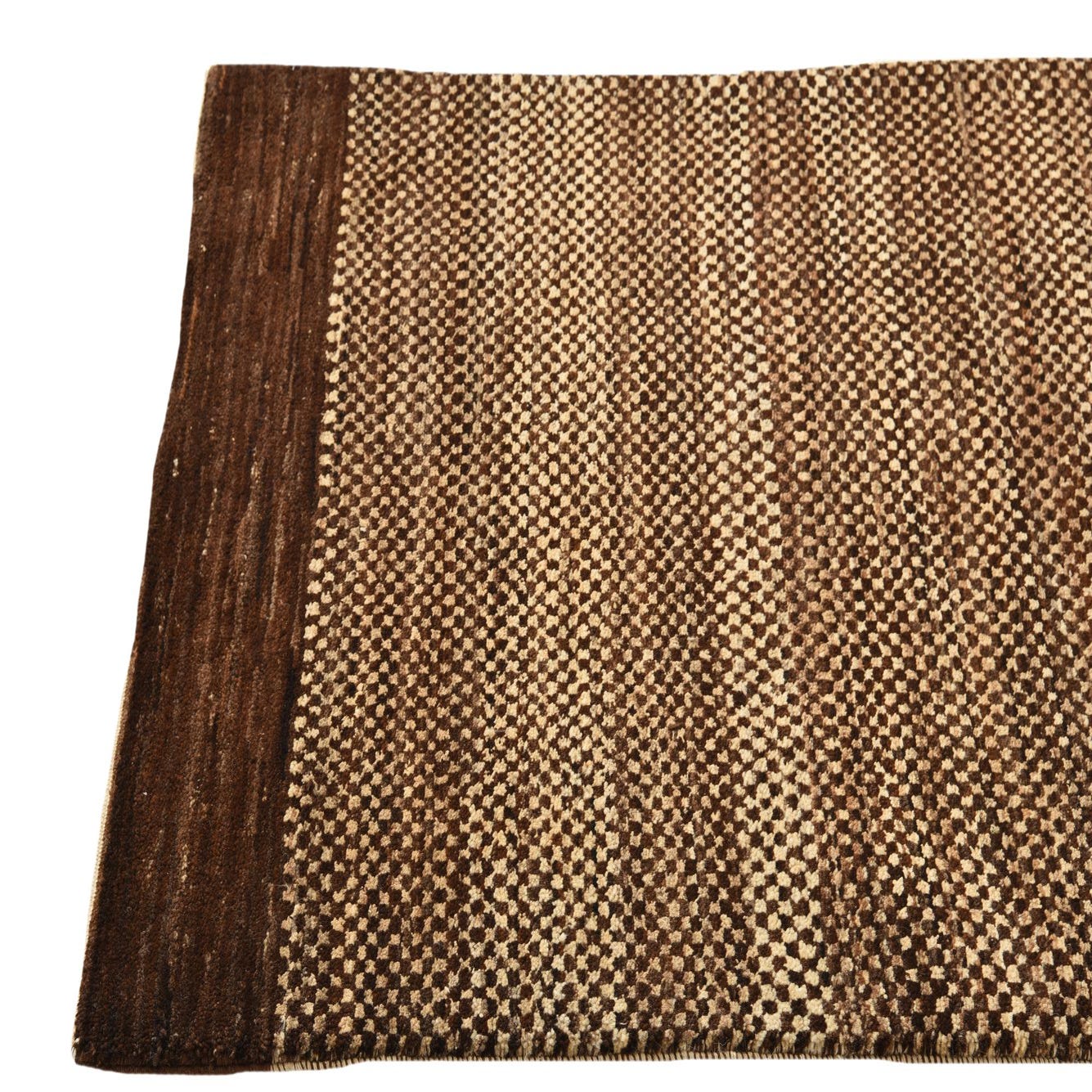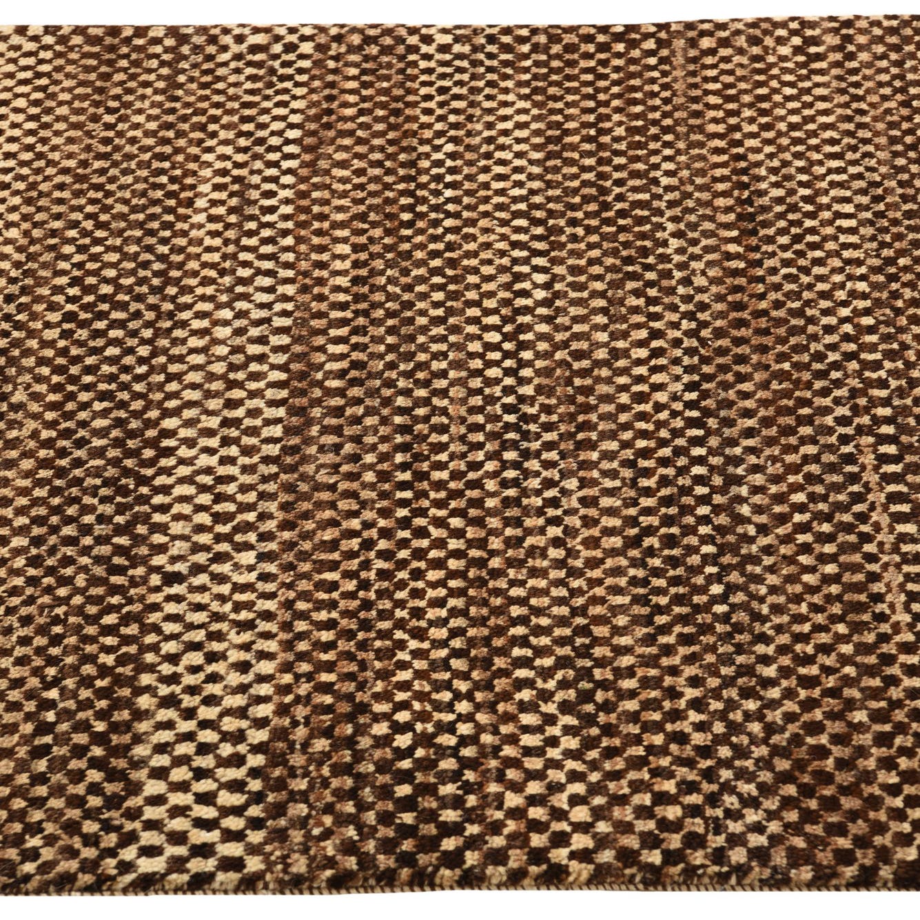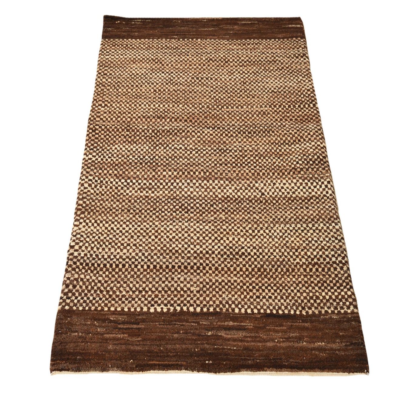 A 3x5 rectangular Kashkuli Gabbeh rug featuring a modern abstract pattern in varying shades of brown and tan, with solid dark brown borders.