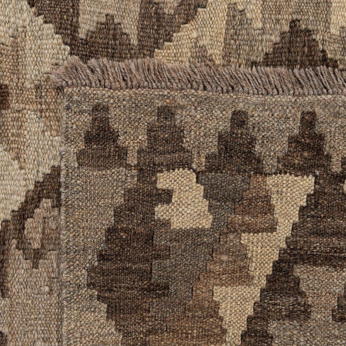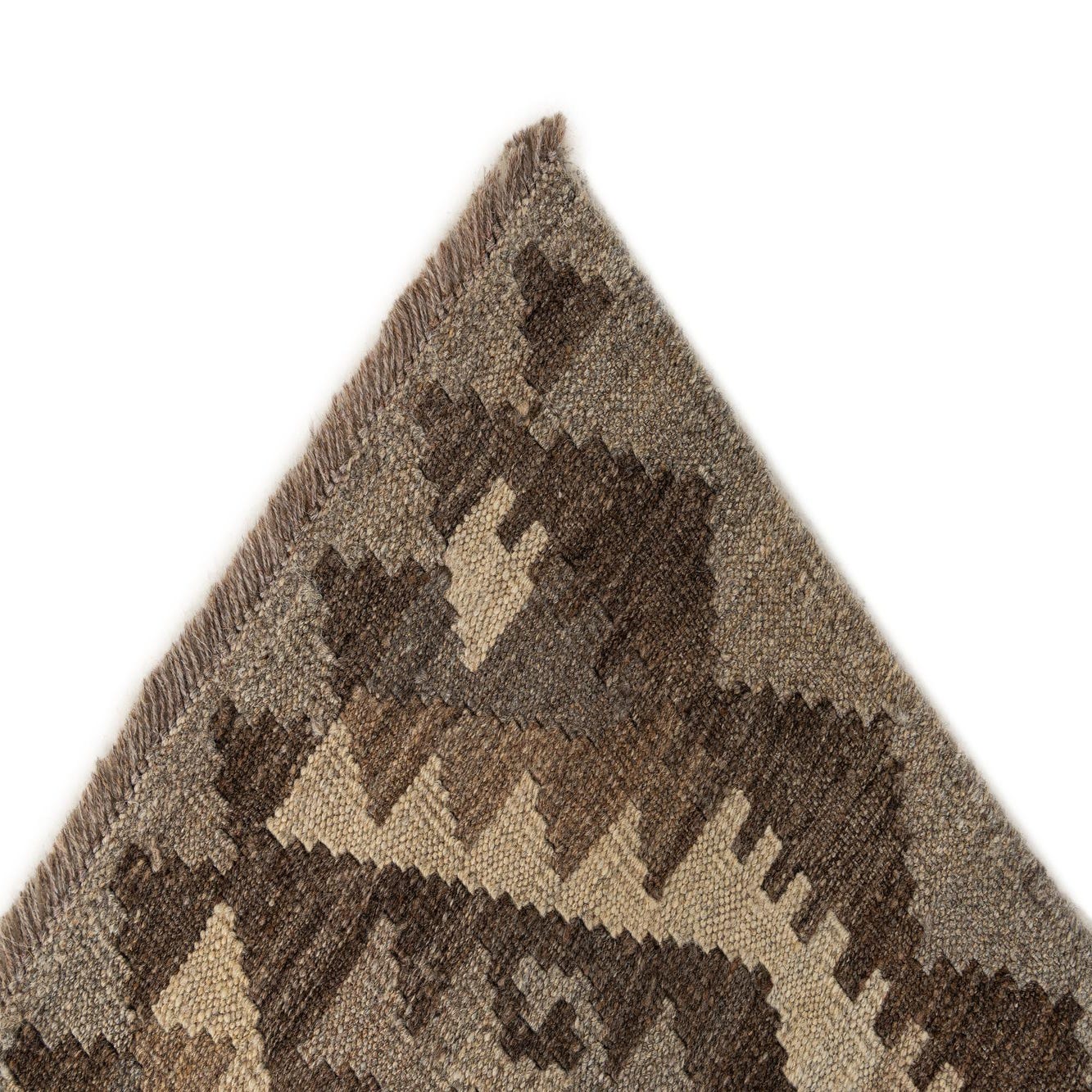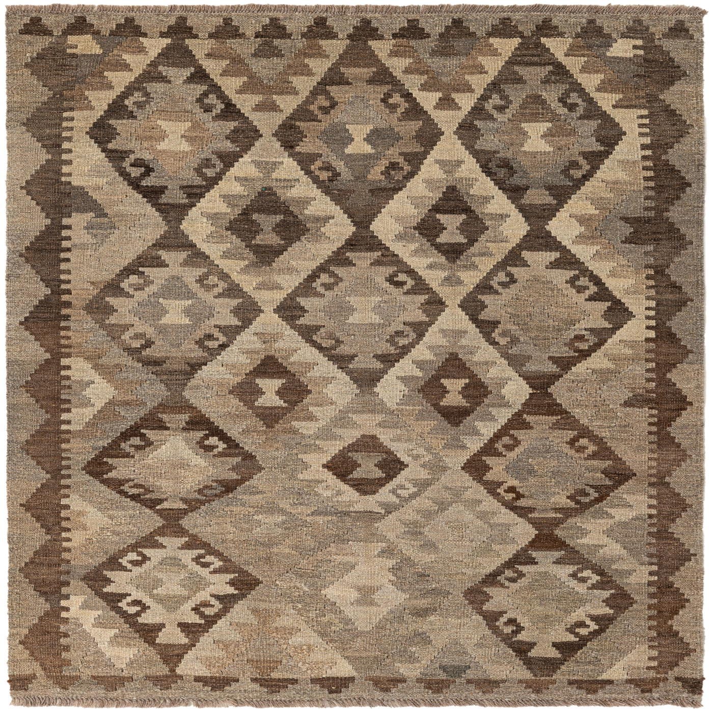 A rectangular 3x5 Kilim Maymana rug with a tribal geometric diamond pattern in varying shades of brown and tan.