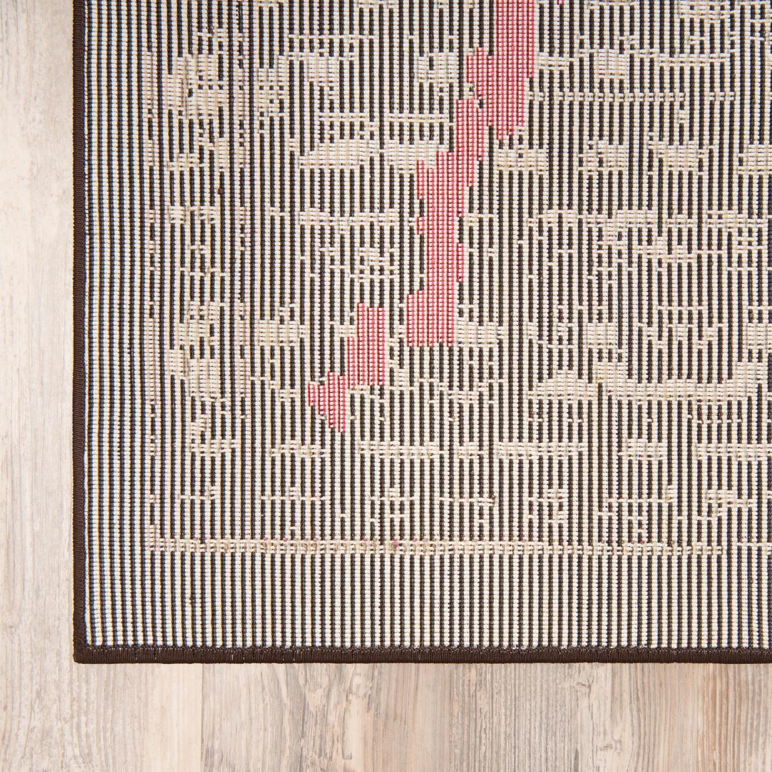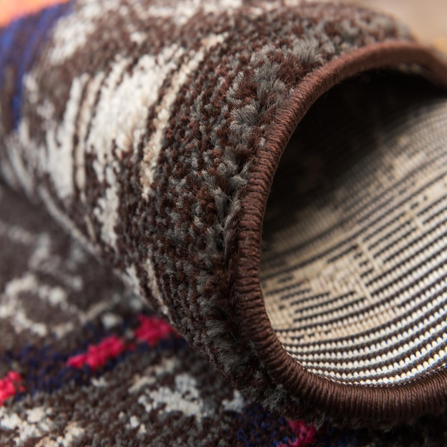 Primary color is Brown. Colors in this rug include: Brown, Beige, Green, Orange, Puce, Purple, Red, Yellow.