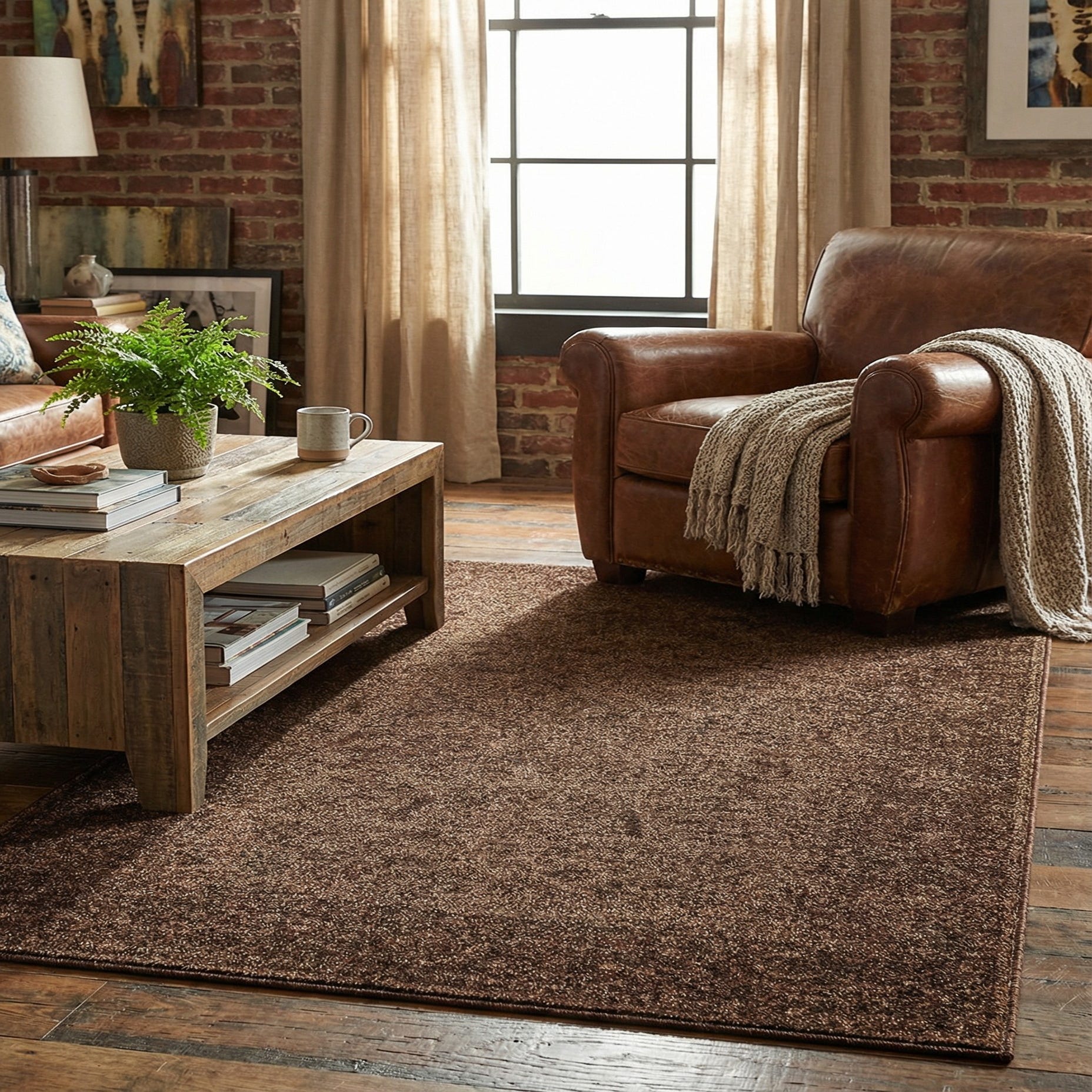 A rich brown field provides a warm, grounded backdrop for a softly defined, traditional motif in beige. The pattern is tone-on-tone with a faded medallion and delicate floral outlines that sit just above the pile, creating subtle contrast and depth without a sharp edge. Machine made from 100% polypropylene, the rug has a low-profile, tightly woven pile with a slight sheen that catches light and highlights the nuanced beige accents against the brown background. Running your hand across the surface reveals a smooth, dense texture that feels substantial underfoot while remaining easy to layer.