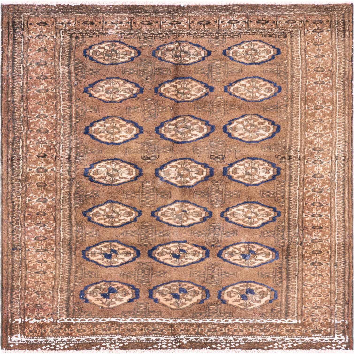 A 3x5 rectangular brown wool rug with a vintage Persian design featuring repeating tan and blue medallion patterns, ideal for an entryway.